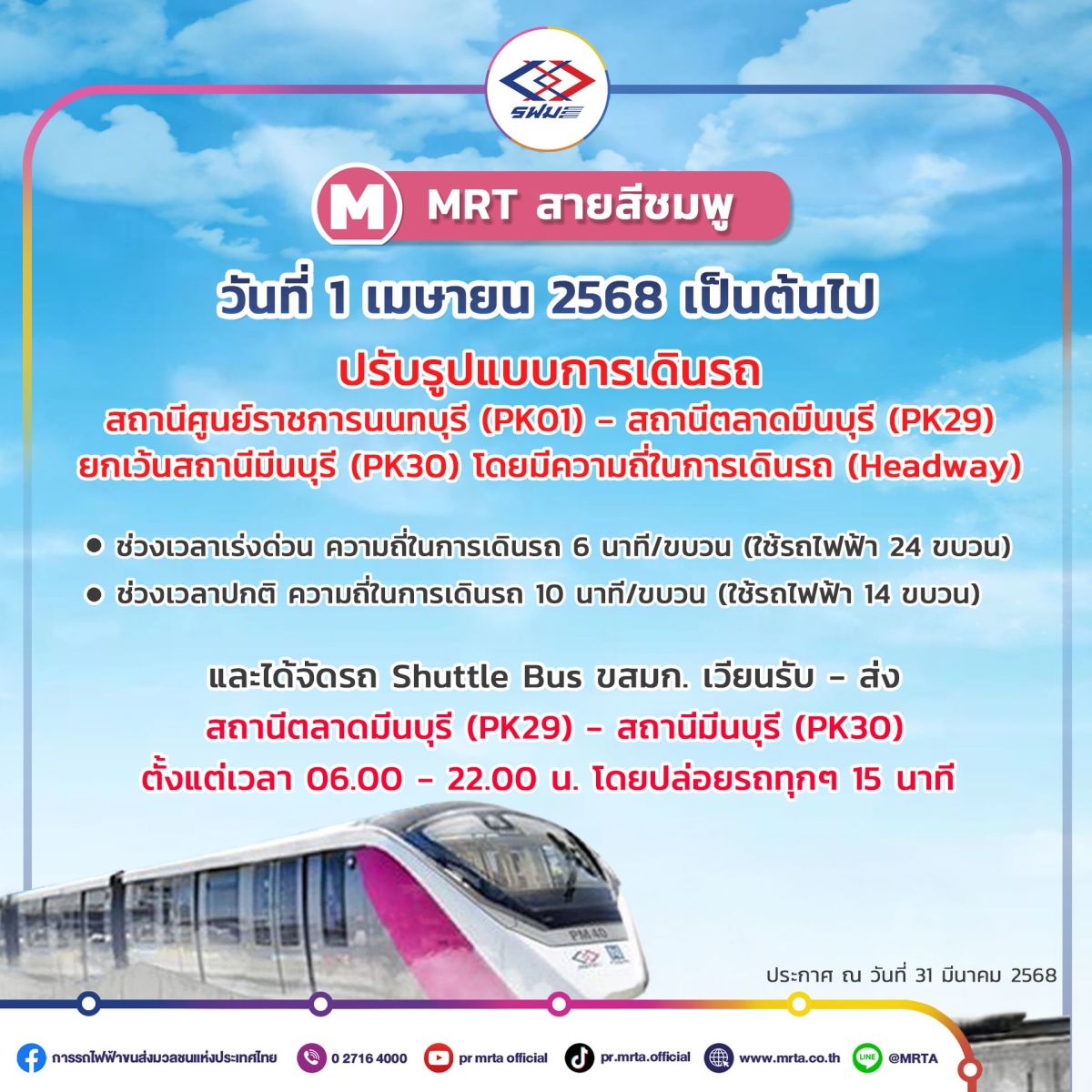 การรถไฟฟ้าขนส่งมวลชนแห่งประเทศไทย (รฟม.) ขอแจ้งว่า ตั้งแต่วันที่ 1 เมษายน 2568 เป็นต้นไป บริษัท นอร์ทเทิร์น บางกอกโมโนเรล จำกัด (NBM) ผู้รับสัมปทานให้บริการรถไฟฟ้ามหานคร สายสีชมพู จะปรับรูปแบบการเดินรถใหม่ เพื่อเพิ่มประสิทธิภาพและอำนวยความสะดวกแก่ผู้โดยสาร โดยให้บริการเดินรถในช่วงสถานีศูนย์ราชการนนทบุรี (PK01) - สถานีตลาดมีนบุรี (PK29) ยกเว้นสถานีมีนบุรี (PK30) โดยมีความถี่ในการเดินรถ ดังนี้