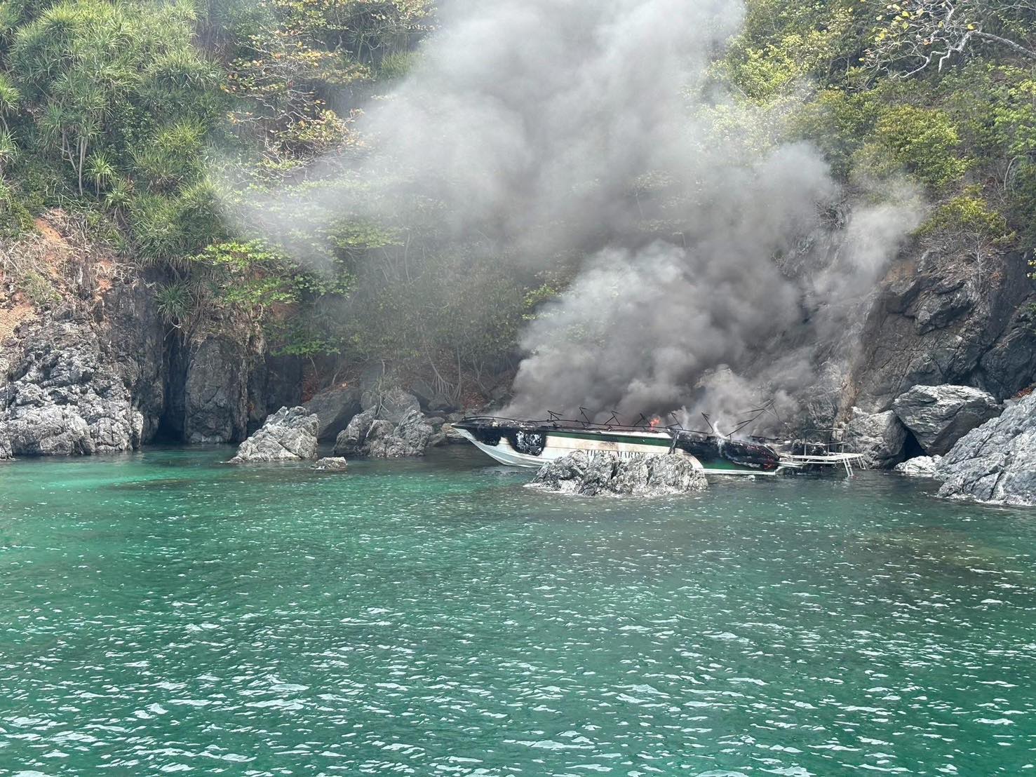 เมื่อเวลา 09.10 น. วันที่ 1 เม.ย.68 ผู้สื่อข่าวรายงานว่า เพจ Phuket Times ภูเก็ตไทม์ แจ้งเกิดเหตุสุดระทึกกลางทะเล บริเวณอ่าวน้ำห้อง หลังเกาะไม้ท่อน จ.ภูเก็ต โดยเหตุการณ์นี้เป็นเหตุไฟไหม้สปีดโบ๊ท ที่อยู่ไม่ห่างจากชายฝั่งมากนัก กลุ่มควันไฟสีดำที่พวยพุ่งเต็มท้องฟ้า เหตุการณ์นี้ สร้างความแตกตื่นให้กับนักท่องเที่ยวที่เห็นเหตุการณ์อย่างมาก รวมถึงคนบนเรือที่พยายามหลบหลบหนีออกมาจากเรือ มีรายงานว่านักท่องเที่ยวบนเรือทั้งหมดปลอดภัยดี