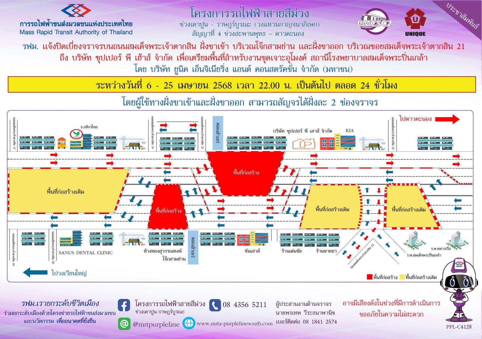 การรถไฟฟ้าขนส่งมวลชนแห่งประเทศไทย (รฟม.) แจ้งว่า บริษัท ยูนิค เอ็นจิเนียริ่ง แอนด์ คอนสตรัคชั่น จำกัด (มหาชน) ผู้รับจ้างงานออกแบบและก่อสร้างอุโมงค์ทางวิ่งและสถานีใต้ดิน โครงการรถไฟฟ้าสายสีม่วง ช่วงเตาปูน - ราษฎร์บูรณะ (วงแหวนกาญจนาภิเษก) สัญญาที่ 4 ช่วงสะพานพุทธ - ดาวคะนอง มีความจำเป็นต้องปิดเบี่ยงจราจรบนถนนสมเด็จพระเจ้าตากสิน ฝั่งขาเข้า บริเวณโจ๊กสามย่าน เเละฝั่งขาออก บริเวณซอยสมเด็จพระเจ้าตากสิน 21 ถึง บริษัท ซุปเปอร์ พี เฮ้าส์ จำกัด เพื่อเตรียมพื้นที่สำหรับงานขุดเจาะอุโมงค์ สถานีโรงพยาบาลสมเด็จพระปิ่นกล้า ระหว่างวันที่ วันที่ 6 - 25 เมษายน 2568 เวลา 22.00 น. เป็นต้นไป ตลอด 24 ชั่วโมง โดยผู้ใช้ทางฝั่งขาเข้าเเละฝั่งขาออก สามารถสัญจรได้ฝั่งละ 2 ช่องจราจร