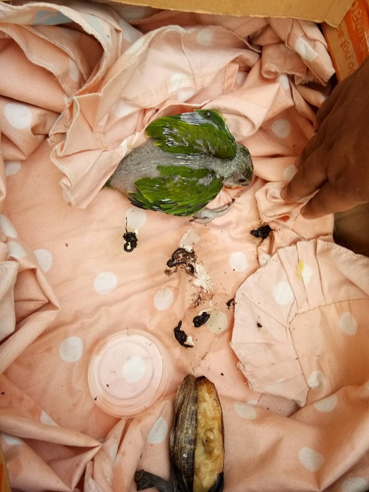เจ้าหน้าที่ชุดดับไฟป่าอช.ลำน้ำน่าน ที่เข้าสกัดไฟป่าในพื้นที่ ได้พบลูกนกแขกเต้า จำนวน 1 ตัว (ขนขึ้นยังไม่เต็ม)อยู่ข้างต้นไม้ล้มตายซึ่งไฟกำลังลุกไหม้เข้าใกล้ตัวน้อง จึงได้ตรวจสอบบริเวณโดยรอบไม่พบครอบครัวนกตัวอื่นๆแต่อย่างใด เจ้าหน้าที่จึงได้ช่วยเหลือนำตัวลูกนกกลับออกมาจากป่าด้วย เนื่องจากน้องยังขนขึ้นไม่เต็ม ยังช่วยเหลือตัวเองยังหาอาหารกินเองไม่ได้ หากปล่อยทิ้งไว้อาจเป็นอันตรายถึงชีวิตได้