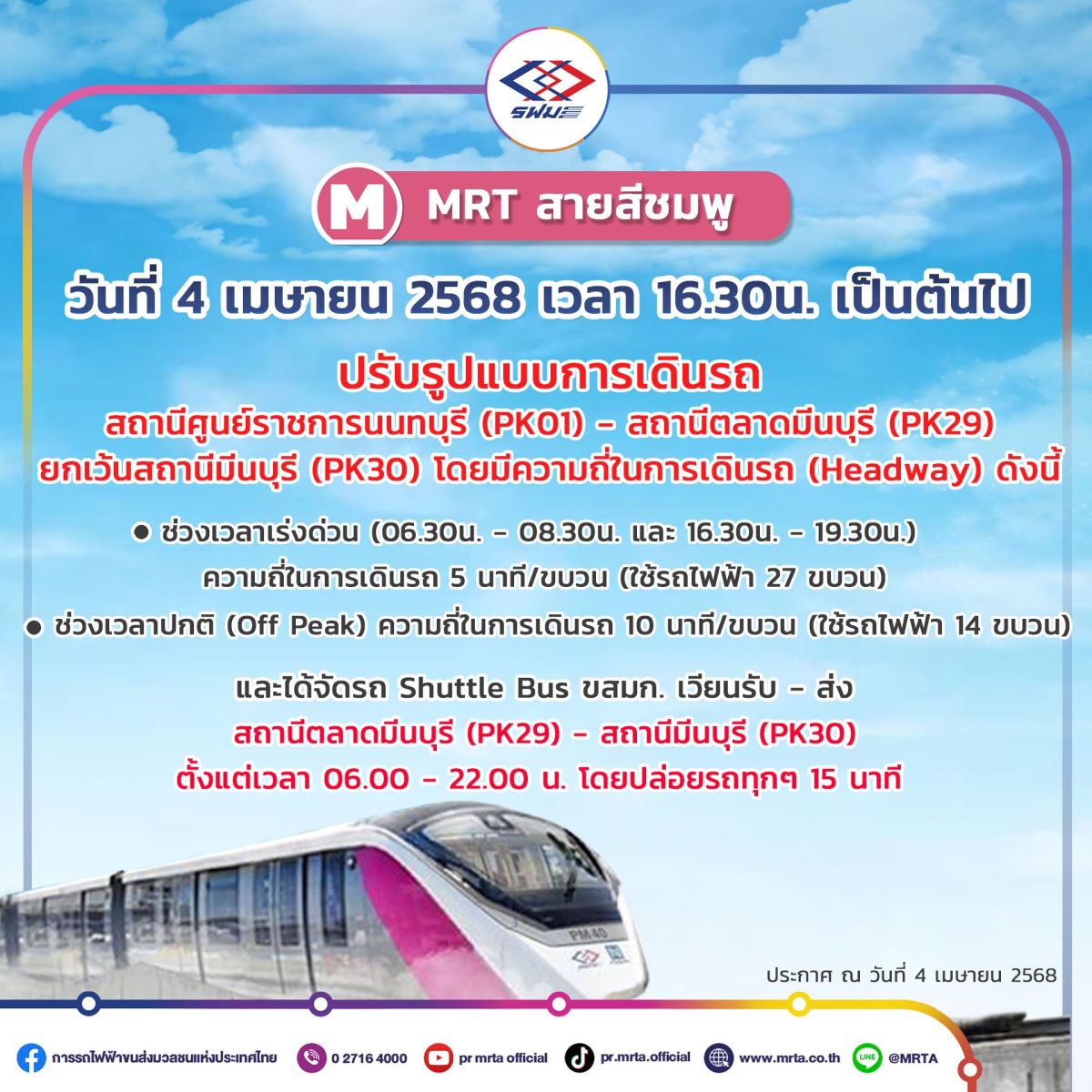 รฟม. แจ้งตั้งแต่วันนี้ 4 เมษายน 2568 เวลา 16.30 น. เป็นต้นไป รถไฟฟ้า MRT สายสีชมพู จะปรับรูปแบบการเดินรถใหม่ ช่วงเร่งด่วน Headway 5 นาที/ขบวน อำนวยความสะดวกให้กับผู้โดยสาร