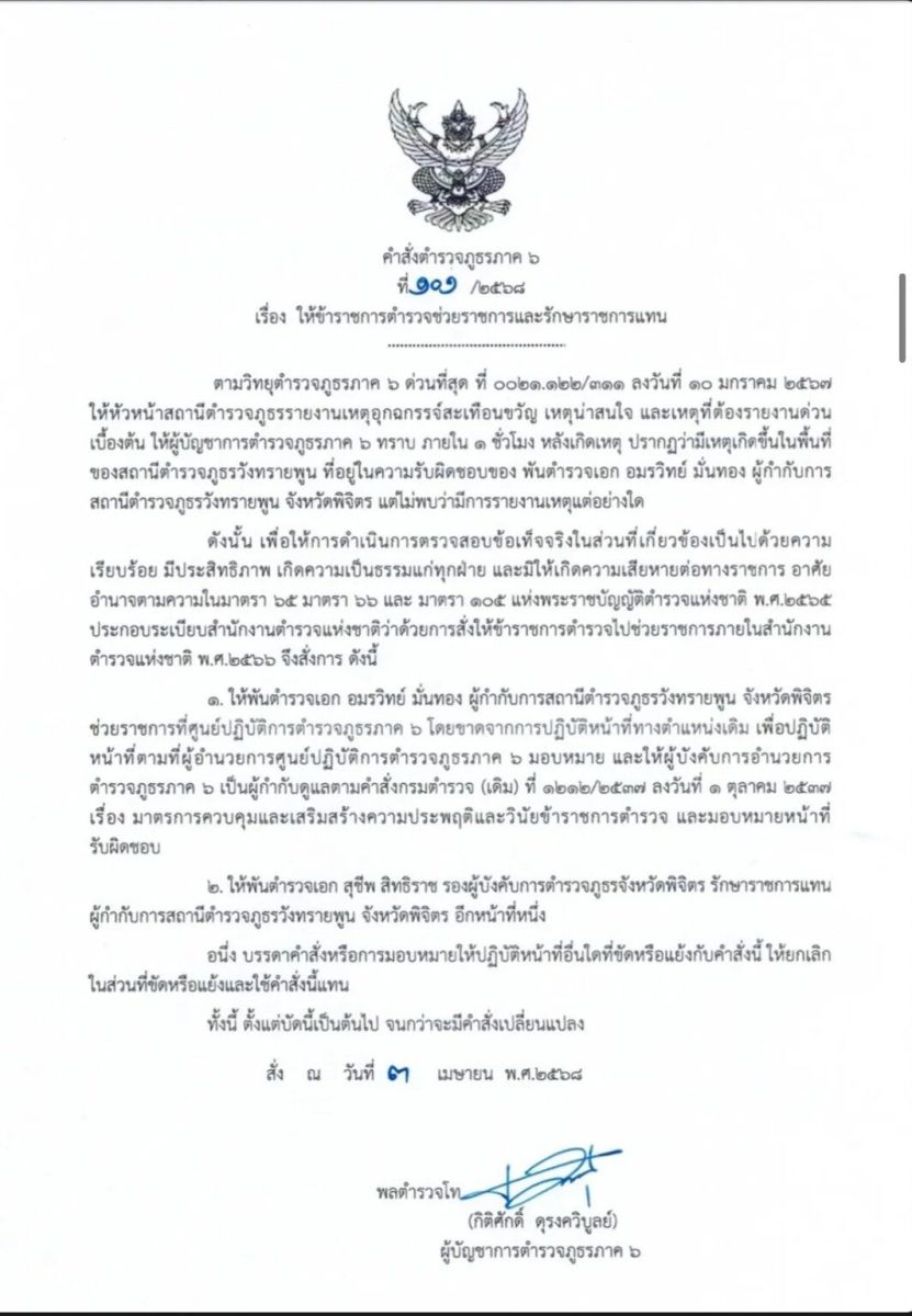 ตามวิทยุตำรวจภูธรภาค 6 ด่วนที่สุด ที่ 0021.122/311 ลงวันที่ 10 มกราคม 2567 ให้หัวหน้าสถานีตำรวจภูธร รายงานเหตุอุกฉกรรจ์สะเทือนขวัญ เหตุน่าสนใจ และเหตุที่ต้องรายงานด่วนเบื้องต้น ให้ผู้บัญชาการตำรวจภูธรภาค 6 ทราบ ภายใน 1 ชั่วโมง หลังเกิดเหตุ ปรากฏว่ามีเหตุเกิดขึ้นพื้นที่ ของสถานีตำรวจภูธรวังทรายพูน ที่อยู่ในความรับผิดชอบของ พันตำรวจเอก อมรวิทย์ มั่นทอง ผู้กำกับการสถานีตำรวจภูธรวังทรายพูน จังหวัดพิจิตร แต่ไม่พบว่ามีการรายงานเหตุแต่อย่างใด