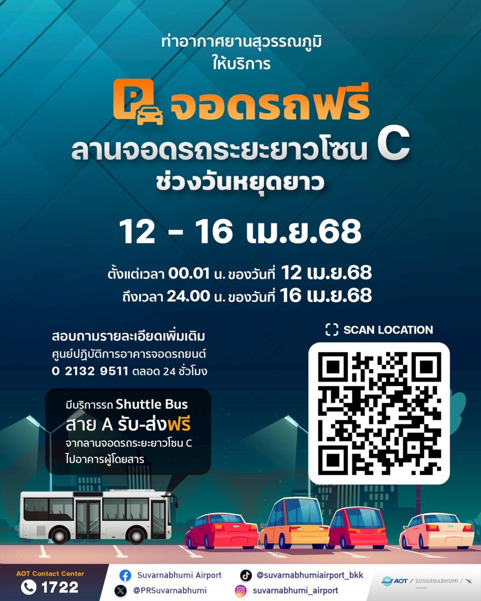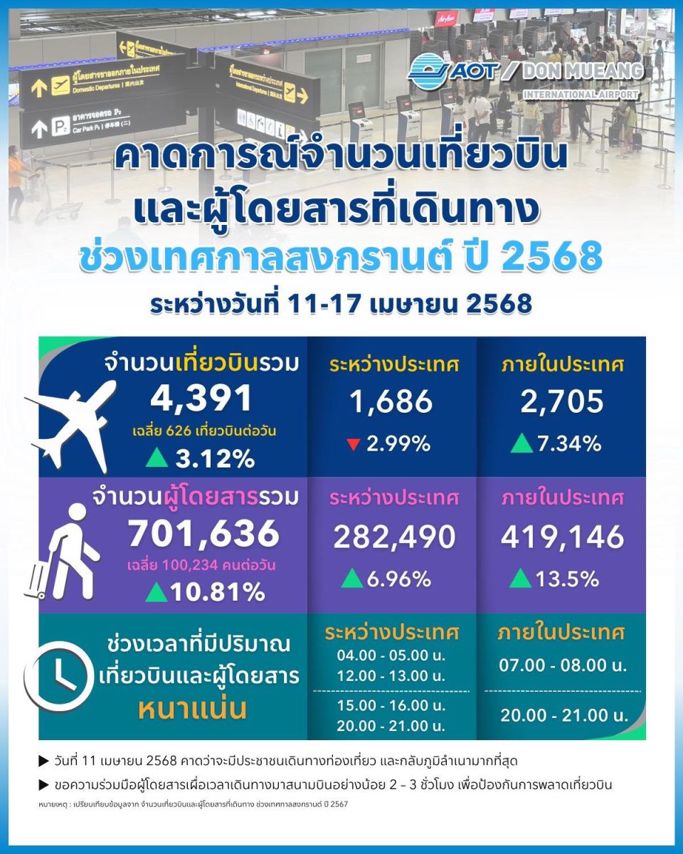 AOT ได้ประมาณการเที่ยวบินและผู้โดยสารในช่วงเทศกาลสงกรานต์ 2568 ระหว่างวันที่ 11 – 17 เมษายน 2568 มีมากกว่า 3 ล้านคน เพิ่มขึ้น 20.5% แบ่งเป็น ผู้โดยสารระหว่างประเทศ 1.86 ล้านคน เพิ่มขึ้น 20.9% และผู้โดยสารภายในประเทศ 1.14 ล้านคน เพิ่มขึ้น 19.9% ขณะที่มีเที่ยวบิน 18,030 เที่ยวบิน เพิ่มขึ้น 20.7% แบ่งเป็น เที่ยวบินระหว่างประเทศ 10,442 เที่ยวบิน เพิ่มขึ้น 25.8% และเที่ยวบินภายในประเทศ 7,588 เที่ยวบิน เพิ่มขึ้น 14.4% โดยที่ ทสภ. คาดว่ามีผู้โดยสาร 1.4 ล้านคน เพิ่มขึ้น 11.9% มีเที่ยวบิน 8,086 เที่ยวบิน เพิ่มขึ้น 17.4% ขณะที่ ทดม. คาดว่ามีผู้โดยสาร 824,786 คน เพิ่มขึ้น 30.3% มีเที่ยวบิน 5,244 เที่ยวบิน เพิ่มขึ้น 23.2% ด้าน ทชม. คาดว่า มีผู้โดยสาร 232,057 คน เพิ่มขึ้น 45.1% มีเที่ยวบิน 1,509 เที่ยวบิน เพิ่มขึ้น 33% ส่วน ทชร. คาดว่า มีผู้โดยสาร 50,148 คน เพิ่มขึ้น 28.7% มีเที่ยวบิน 294 เที่ยวบิน เพิ่มขึ้น 14.8% สำหรับ ทภก. คาดว่ามีผู้โดยสาร 404,831 คน เพิ่มขึ้น 17.1% เที่ยวบิน 2,391 เที่ยวบิน เพิ่มขึ้น 19% และ ทหญ. คาดว่ามีผู้โดยสาร 90,796 คน เพิ่มขึ้น 47.7% เที่ยวบิน 506 เที่ยวบิน เพิ่มขึ้น 30.7% ซึ่งจากตัวเลขการเดินทางและการท่องเที่ยวของประชาชนที่เติบโตอย่างต่อเนื่อง กระทรวงคมนาคมและ AOT ร่วมส่งมอบความสุขให้ประชาชนที่จะเดินทางในช่วงเทศกาลสงกรานต์ 2568 โดยจัดที่จอดรถยนต์ฟรี 4 สนามบิน เริ่มตั้งแต่เวลา 00.01 น. ของวันที่ 12 เมษายน 2568 จนถึงเวลา 24.00 น. ของวันที่ 16 เมษายน 2568 ได้แก่ ทสภ. ณ ลานจอดรถระยะยาว (Long Term Parking) โซน C ทดม.บริเวณ ลานจอดรถยนต์หน้าอาคารจอดรถยนต์ 5 ชั้น ทชม. ณ บริเวณลานช้าง ข้างอาคารผู้โดยสารระหว่างประเทศ และที่ ทภก.บริเวณหน้าอาคารสำนักงาน ทภก.ตั้งแต่เวลา 00.01 น.ของวันที่ 11 เมษายน 2568 ถึงเวลา 23.59 น.ของวันที่ 16 เมษายน 2568