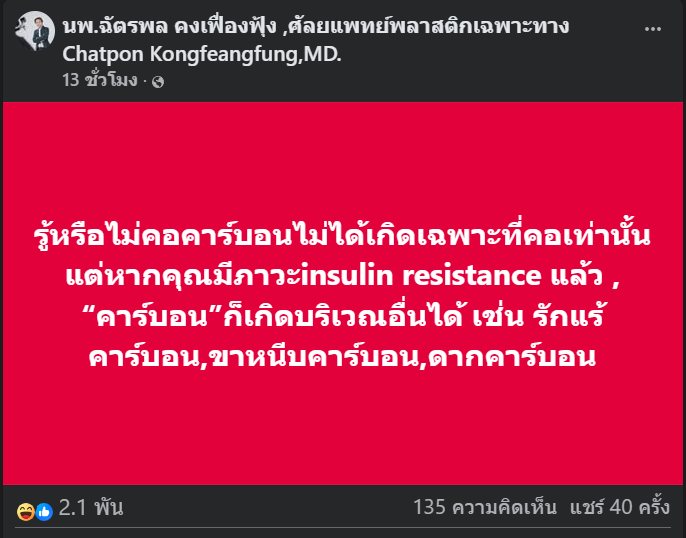 โดย นพ.ฉัตรพล ระบุว่า คนที่มีภาวะด้านหลังคอ ข้างๆคอ มีเป็นรอยปื้นดำ หรือที่หลายคนพากันเรียกว่า "คอคาร์บอน" ไม่ใช่แค่ศํพท์วัยรุ่น แต่บ่งบอกถึงภาวะสุขภาพสำคัญ