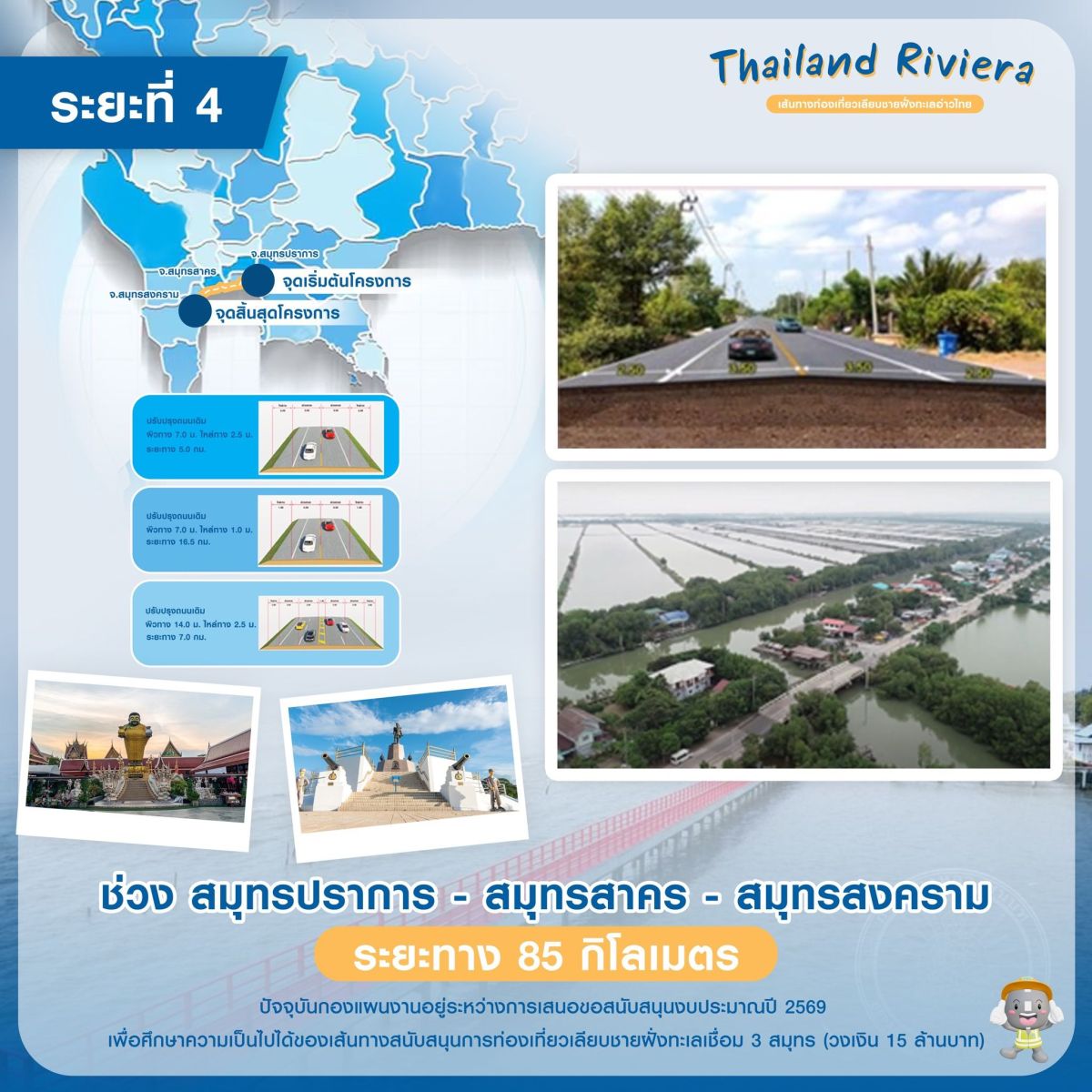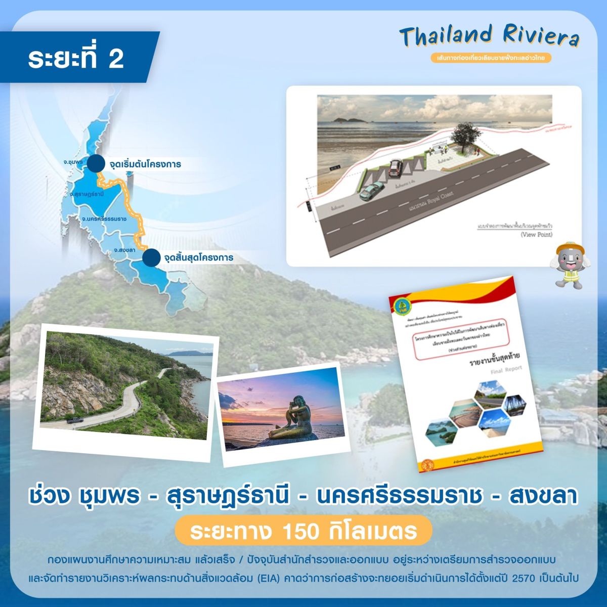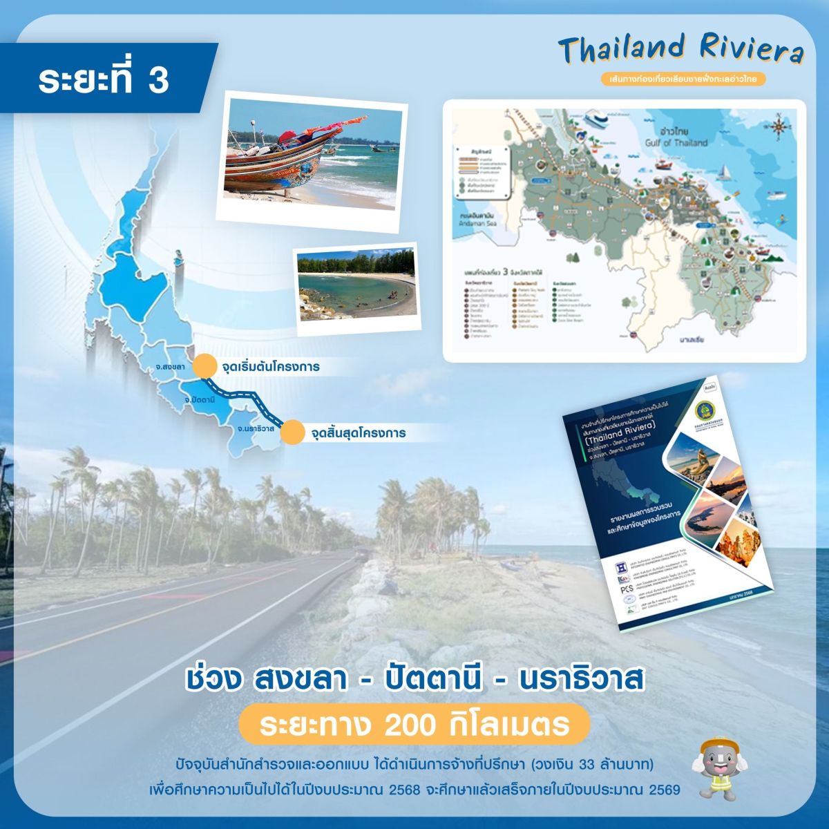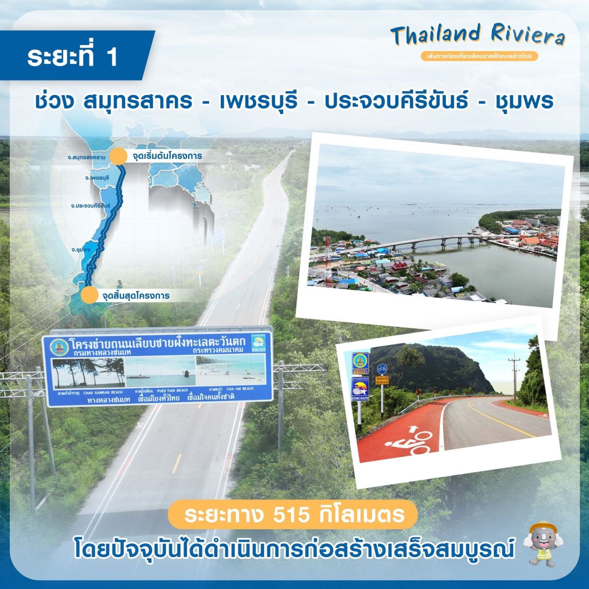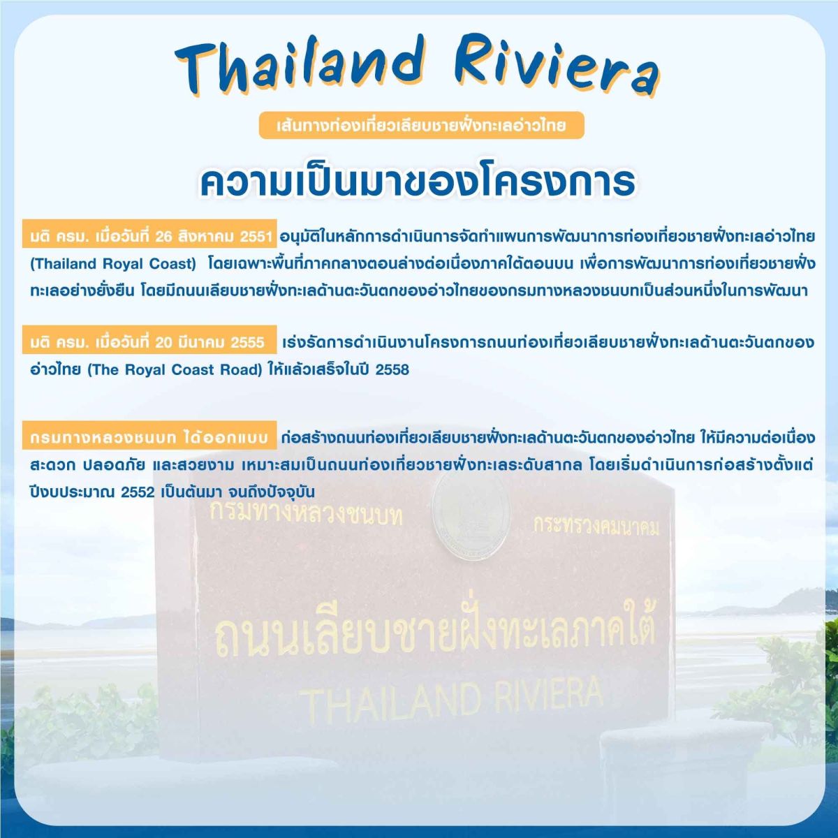 นายมนตรี เดชาสกุลสม อธิบดีกรมทางหลวงชนบท เปิดเผยว่า กรมทางหลวงชนบท (ทช.) ได้ดำเนินการตามที่คณะรัฐมนตรีเห็นชอบในโครงการพัฒนาการท่องเที่ยวถนนเลียบชายฝั่งทะเลด้านตะวันตกของอ่าวไทยอย่างยั่งยืน เพื่อพัฒนาโครงข่ายถนนดังกล่าวให้มีความต่อเนื่อง ส่งเสริมเศรษฐกิจการท่องเที่ยว ยกระดับคุณภาพชีวิตให้ประชาชน นักท่องเที่ยวได้รับความสะดวกปลอดภัยในการเดินทาง ตลอดจนการแก้ไขปัญหาจราจรและเหมาะสมเป็นถนนท่องเที่ยวชายฝั่งทะเลระดับสากล โดยเริ่มดำเนินการก่อสร้างตั้งแต่ปีงบประมาณ 2552 เป็นต้นมา จนถึงปัจจุบัน ซึ่ง Thailand Riviera เป็นเส้นทางท่องเที่ยวเลียบชายฝั่งทะเลอ่าวไทย มีพื้นที่ดำเนินการตั้งแต่ สมุทรปราการ – สมุทรสาคร – สมุทรสงคราม – เพชรบุรี – ประจวบคีรีขันธ์ – ระนอง – ชุมพร – สุราษฎร์ธานี – นครศรีธรรมราช – สงขลา – ปัตตานี – นราธิวาส แบ่งเป็น 4 ระยะ รวมระยะทาง 950 กิโลเมตร ดังนี้