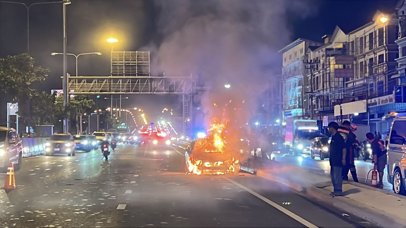 โชเฟอร์แท็กซี่ พร้อมผู้โดยสารหนีตาย กลางถนนราชพฤกษ์ หลังมีเสียงระเบิดดังขึ้นก่อนไฟลุกไหม้ท่วมรถ จ.นนทบุรี