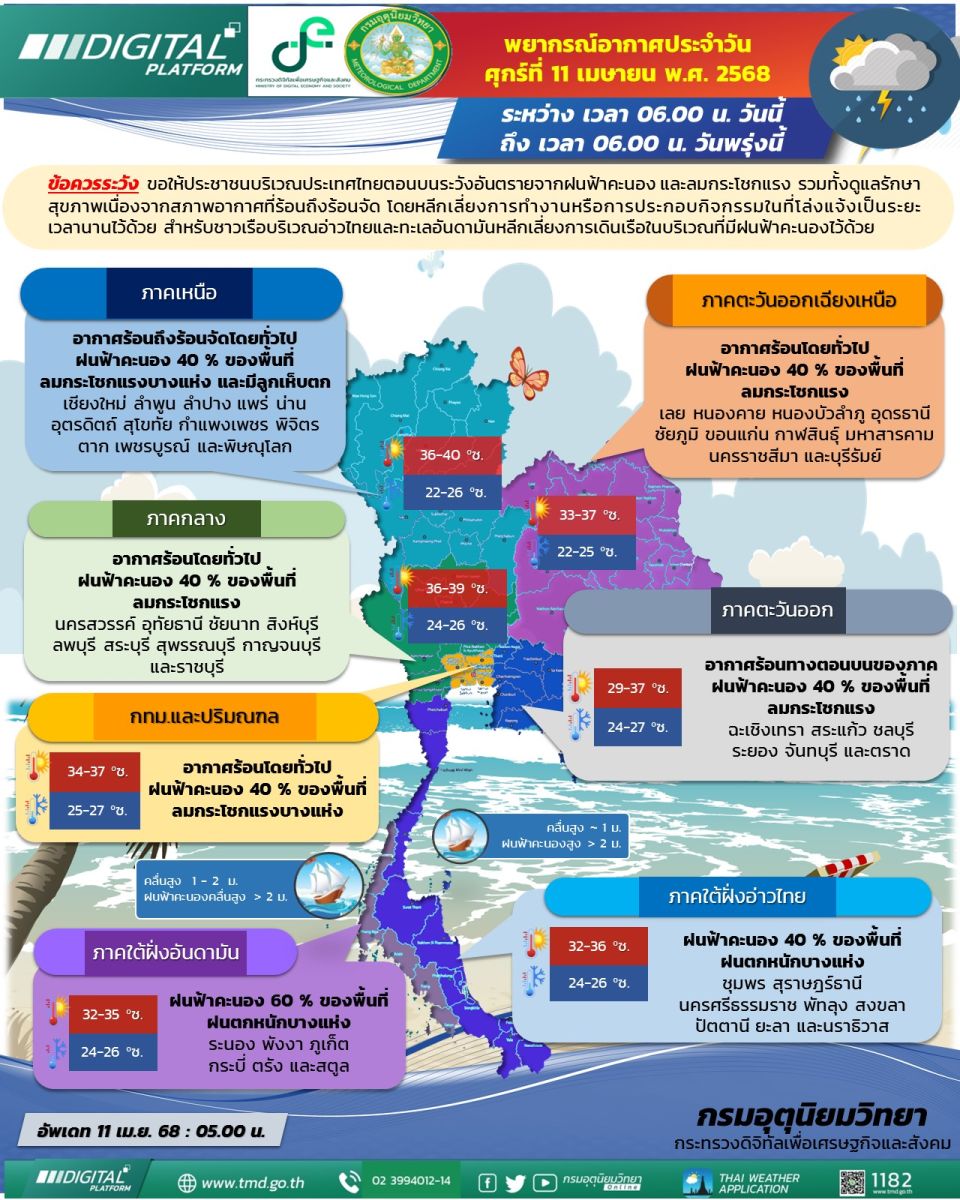 อนึ่ง ในช่วงวันที่ 12-14 เม.ย. 68 บริเวณประเทศไทยตอนบนจะมีพายุฤดูร้อนเกิดขึ้น โดยมีลักษณะของพายุฝนฟ้าคะนอง ลมกระโชกแรง และลูกเห็บตกบางแห่ง รวมถึงฟ้าผ่าที่อาจเกิดขึ้นได้บางพื้นที่ ทั้งนี้เนื่องจากบริเวณความกดอากาศสูงหรือมวลอากาศเย็นกำลังปานกลางจากประเทศจีนจะแผ่ลงมาปกคลุมภาคตะวันออกเฉียงเหนือของประเทศไทยและทะเลจีนใต้ ในขณะที่ประเทศไทยตอนบนมีอากาศร้อนถึงร้อนจัด