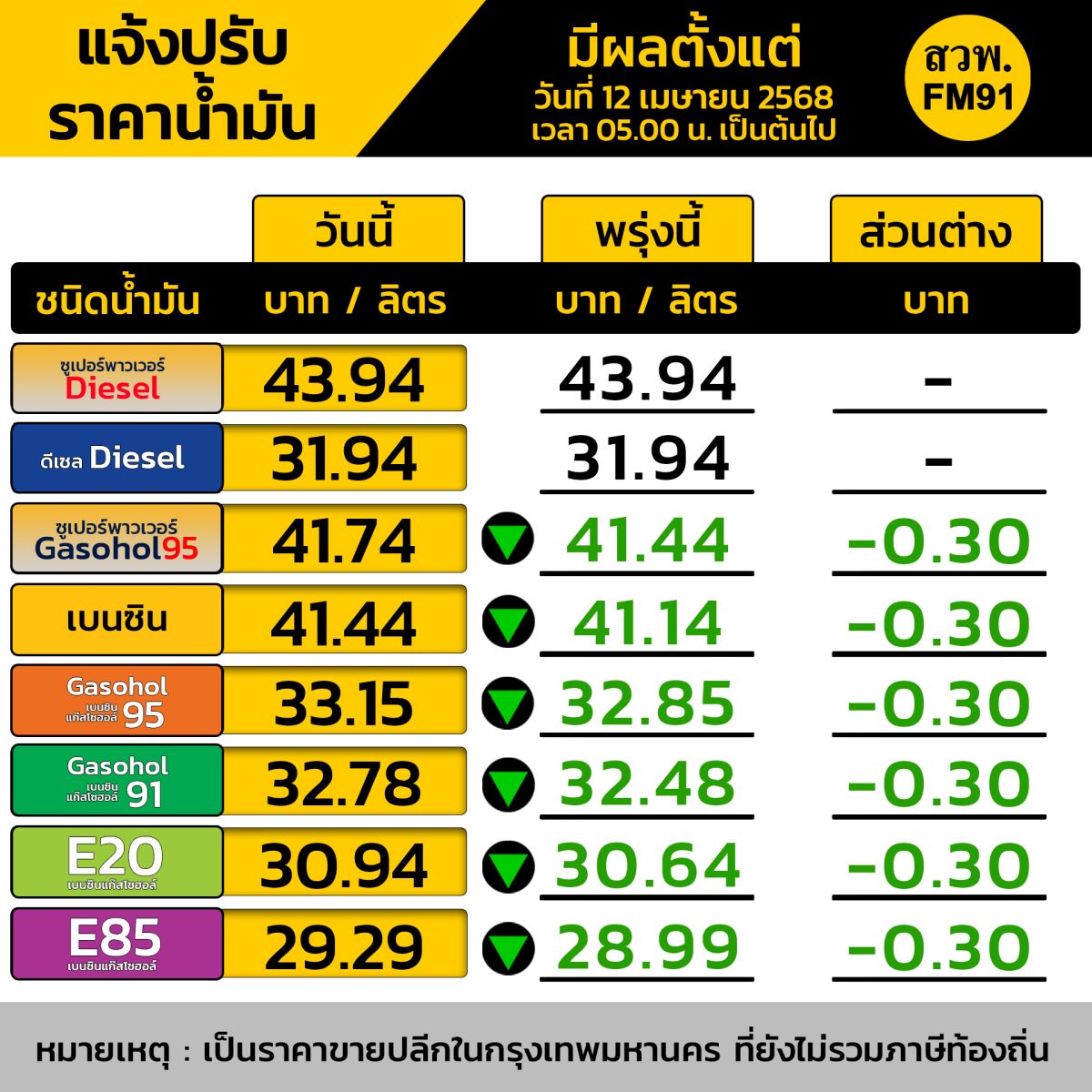 มีผลวันที่ 12 เม.ย. 68 ตั้งแต่ เวลา 05.00 น. เป็นต้นไป