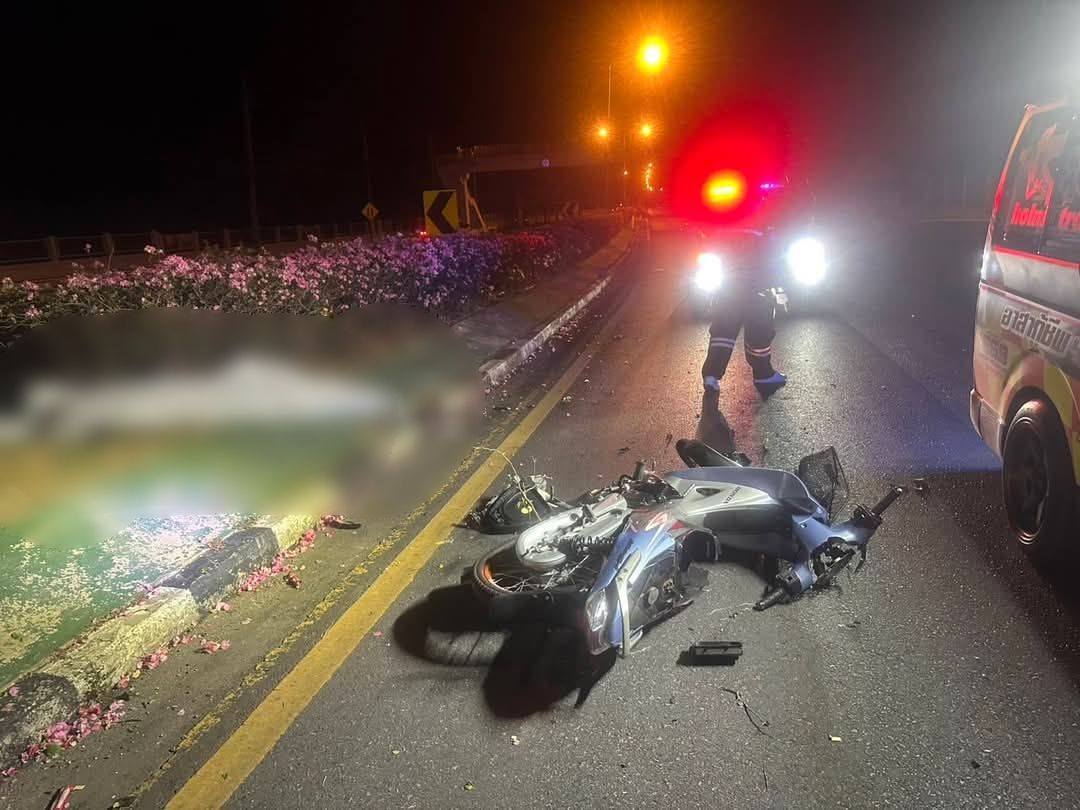 รถจักรยานยนต์เสียหลักหลุดโค้งชนเสาไฟจราจร เสียชีวิตที่เกาะกลาง ถนนพหลโยธิน จ.ลพบุรี