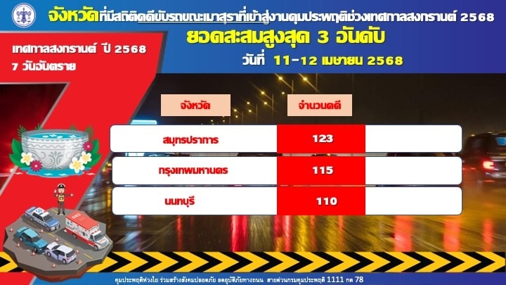 ส่วนจังหวัดที่มีสถิติคดีขับรถขณะเมาสุราสูงสุด 3 อันดับแรก ได้แก่ 1. สมุทรปราการ จำนวน 123 คดี 2. กรุงเทพมหานคร จำนวน 115 คดี และนนทบุรี จำนวน 110 คดี