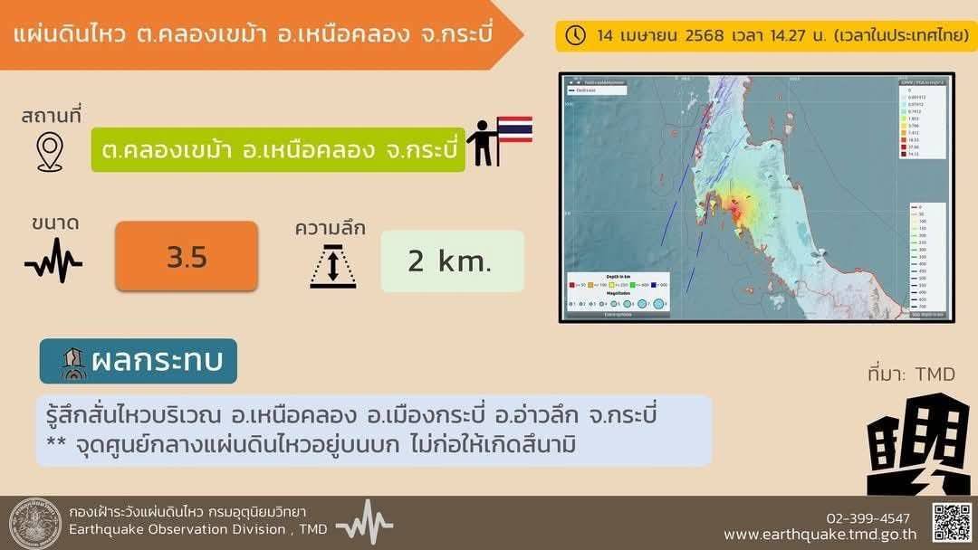 วันนี้ (14 เม.ย. 68) กรมป้องกันและบรรเทาสาธารณภัย โดยศูนย์เตือนภัยพิบัติแห่งชาติ แจ้งว่า เมื่อเวลา 14.27 น. เกิดแผ่นดินไหวบนบก ขนาด 3.5 ความลึก 2 กิโลเมตร จุดศูนย์กลางอยู่บริเวณ ต.คลองเขม้า อ.เหนือคลอง จ.กระบี่ ละติจูด 8.022 องศาเหนือ ลองจิจูด 98.978 องศาตะวันออก ซึ่งแผ่นดินไหวนี้จุดศูนย์กลางอยู่บนบก จึงไม่ก่อให้เกิดสึนามิ
