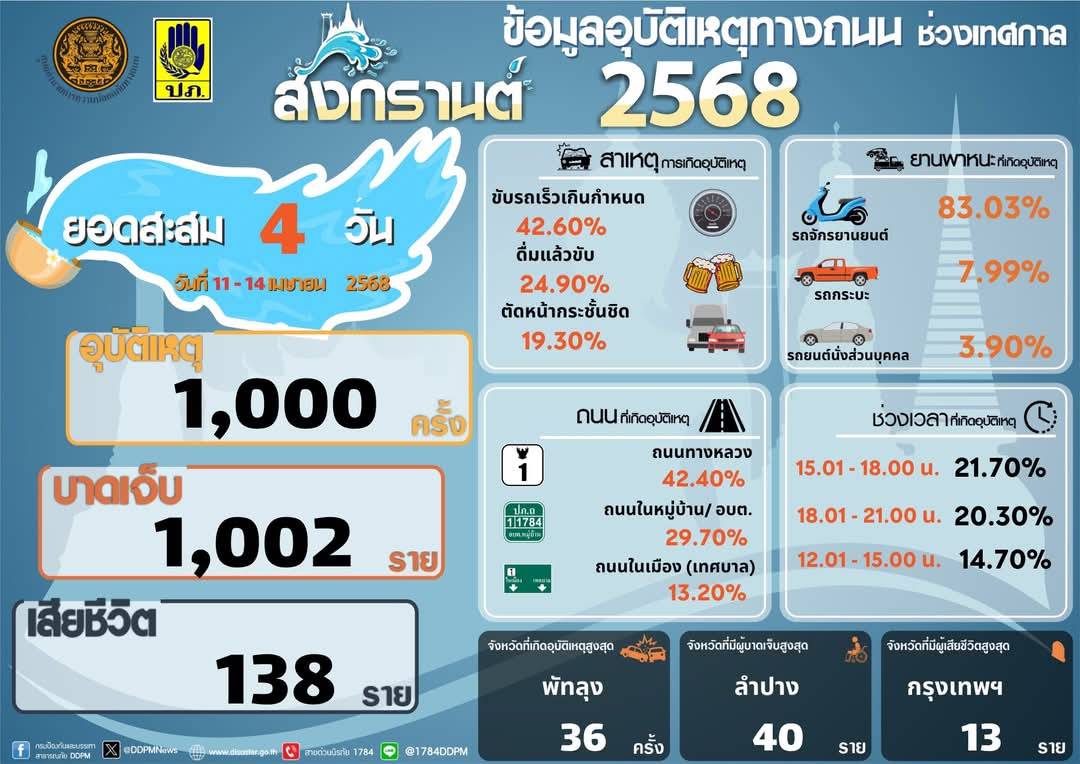 สรุปอุบัติเหตุทางถนนสะสมในช่วง 4 วันของการรณรงค์ (11 เมษายน – 14 เมษายน 2568) เกิดอุบัติเหตุรวม 1,000 ครั้ง ผู้บาดเจ็บรวม 1,002 คน ผู้เสียชีวิต รวม 138 ราย จังหวัดที่ไม่มีผู้เสียชีวิต (ตายเป็นศูนย์) มี 24 จังหวัด จังหวัดที่เกิดอุบัติเหตุสะสมสูงสุด ได้แก่ พัทลุง (36 ครั้ง) จังหวัดที่มีผู้บาดเจ็บสะสมสูงสุด ได้แก่ ลำปาง (40 คน) จังหวัดที่มีผู้เสียชีวิตสะสมสูงสุด ได้แก่ กรุงเทพมหานคร (13 ราย)