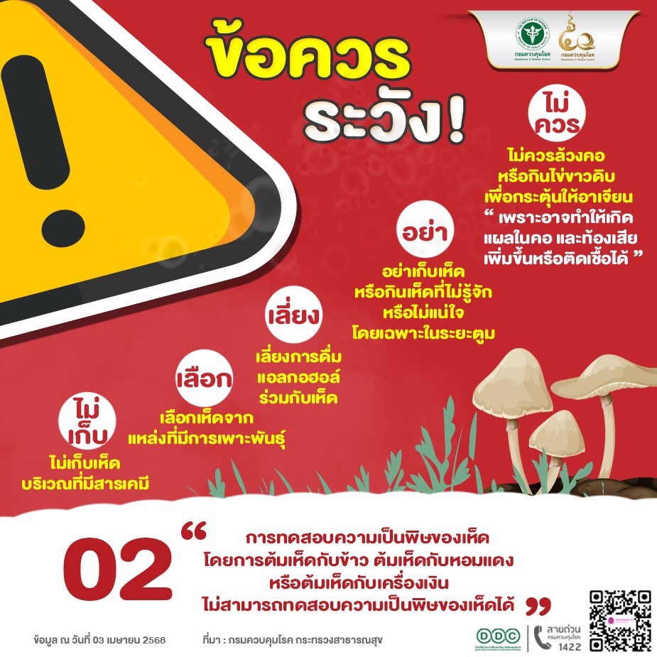 นายคารม ขอให้ประชาชนหลีกเลี่ยงการเก็บและกินเห็ดป่า เห็ดที่ขึ้นเองตามธรรมชาติที่ไม่รู้จักหรือไม่แน่ใจว่ากินได้ และไม่เก็บเห็ดบริเวณที่มีการใช้สารเคมี เนื่องจากเห็ดจะดูดซับพิษจากสารเคมีมาไว้ในดอกเห็ด รวมถึงไม่กินเห็ดดิบ เช่น เห็ดน้ำหมาก หรือกินเห็ดร่วมกับเครื่องดื่มที่มีส่วนผสมของแอลกอฮอล์ เช่น เห็ดหิ่งห้อย เห็ดน้ำหมึก หรือเห็ดถั่วที่ขึ้นตามธรรมชาติ เพราะจะทำให้เกิดพิษได้ พึงระลึกเสมอว่าเห็ดพิษทุกชนิดแม้ทำให้สุกด้วยความร้อนก็ไม่สามารถทำลายพิษได้ และยึดหลัก “เห็ด ไม่รู้จัก ไม่แน่ใจ ไม่เก็บ ไม่กิน” หากมีข้อสงสัยสอบถามข้อมูลเพิ่มเติมได้ที่ สายด่วนกรมควบคุมโรค โทร. 1422