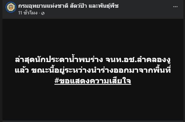 ล่าสุด เวลา 22.00 น. กรมอุทยานแห่งชาติ สัตว์ป่า และพันธุ์พืช โพสต์ข้อความแจ้งว่า “ล่าสุดนักประดาน้ำพบร่าง จนท.อช.ลำคลองงูแล้ว ขณะนี้อยู่ระหว่างนำร่างออกมาจากพื้นที่ #ขอแสดงความเสียใจ”