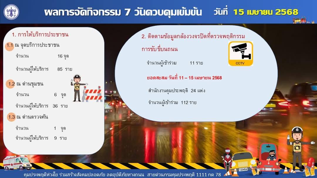 โดยยอดคดีสะสมช่วงควบคุมเข้มข้น 11-15 เมษายน 2568 รวม 3,716 คดี ติดอุปกรณ์ EM รวม 25 ราย