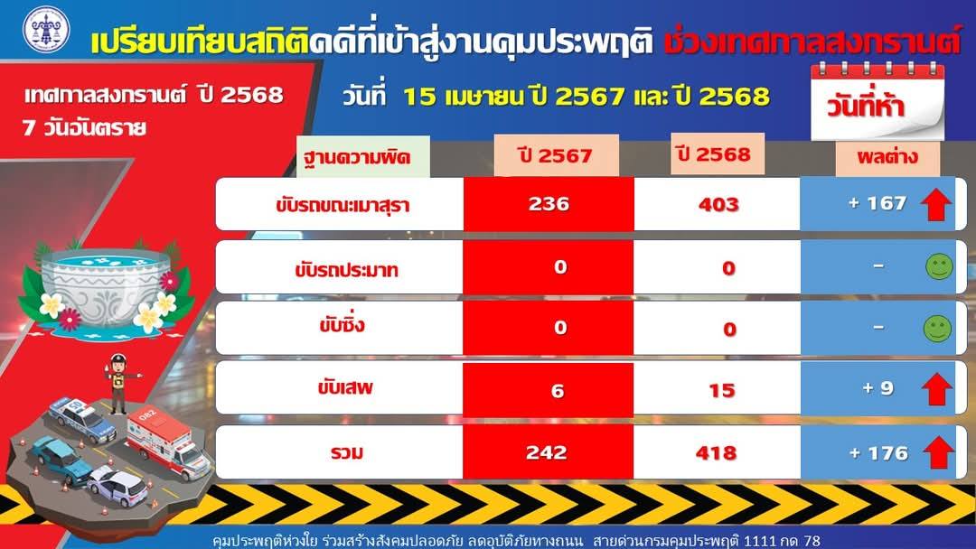 ทั้งนี้ เมื่อเปรียบเทียบสถิติคดีที่เข้าสู่การคุมความประพฤติวันที่ 5 ของปี 2567 พบว่า มีคดีขับรถขณะเมาสุรา จำนวน 236 คดี และ ปี 2568 มีจำนวน 403 คดี เพิ่มขึ้น 167 คดี ซึ่งจังหวัดที่มีคดีเมาขับสูงสุด ได้แก่ กรุงเทพมหานคร 295 คดี นนทบุรี 242 คดี และสมุทรปราการ 226 คดี