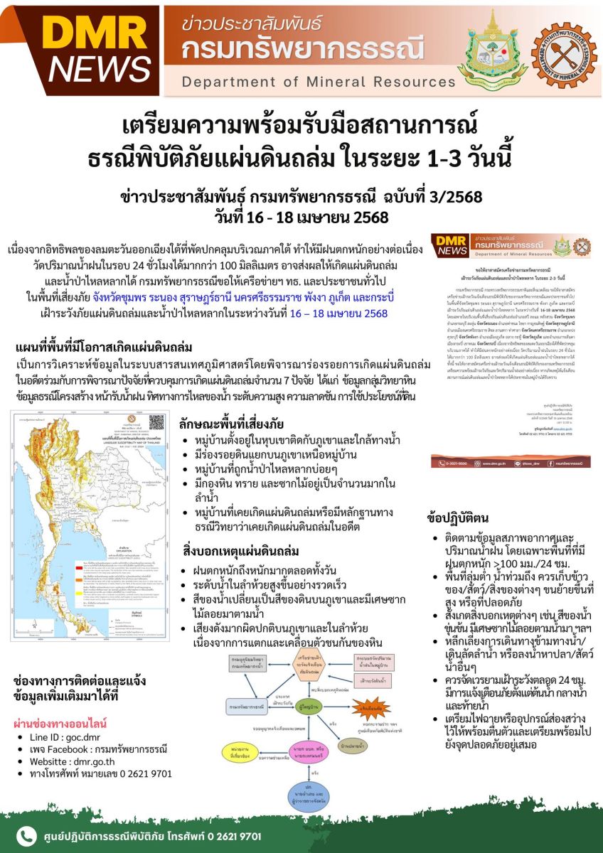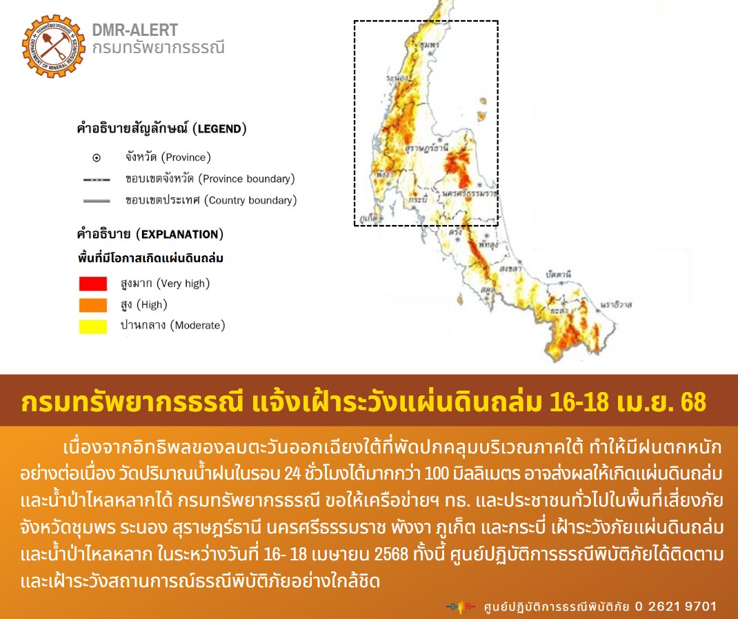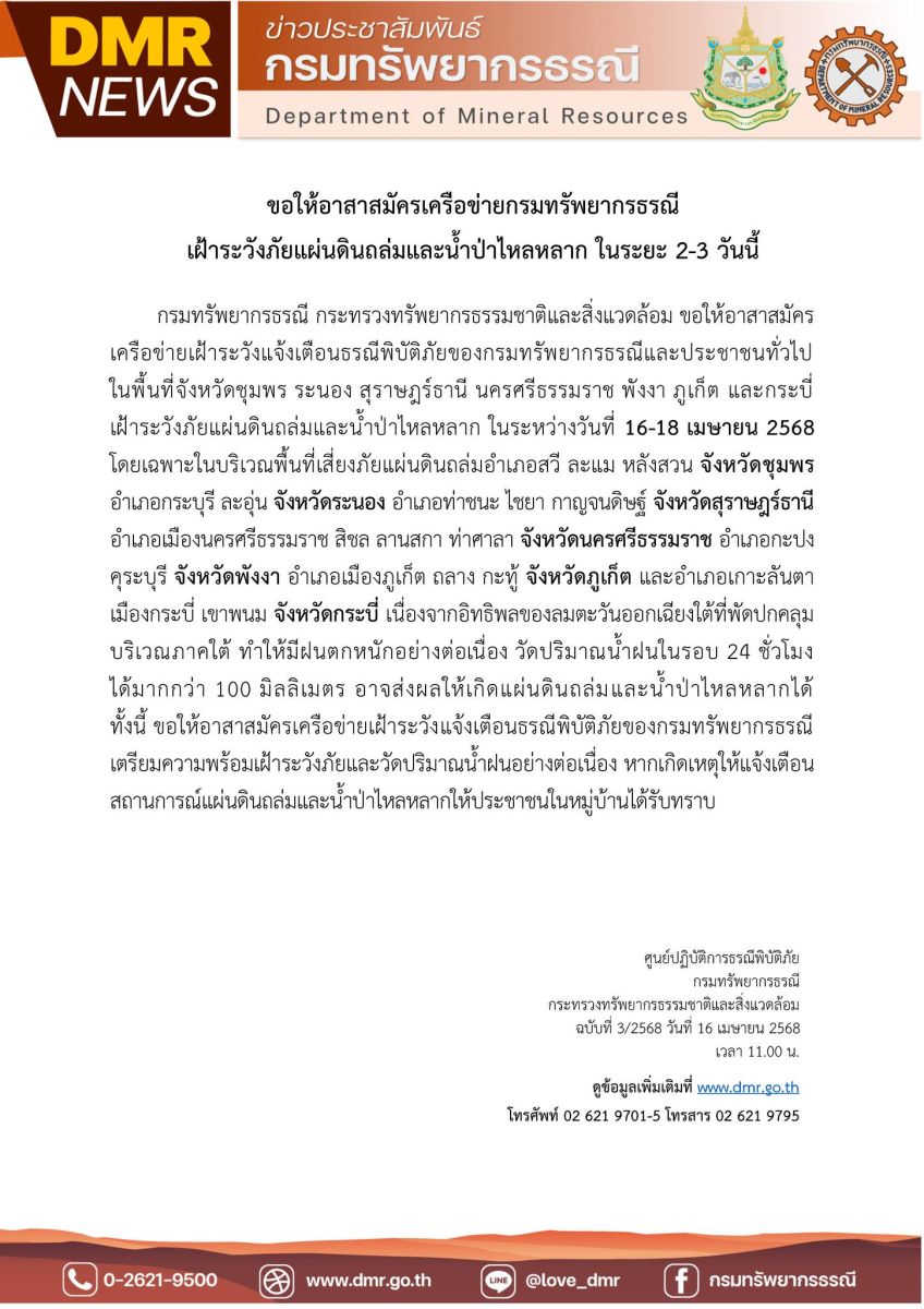 16 เมษาายน 2568 ศูนย์ปฎิบัติการธรณีพิบัติภัย กรมทรัพยากรธรณี กระทรวงทรัพยากรธรรมชาติและสิ่งแวดล้อม ประชาสัมพันธ์ ขอให้อาสาสมัคร เครือข่ายเฝ้าระวังแจ้งเตือนธรณีพิบัติภัยของกรมทรัพยากรธรณีและประชาชนทั่วไป ในพื้นที่จังหวัด ชุมพร ระนอง สุราษฎร์ธานี นครศรีธรรมราช พังงา ภูเก็ต และ กระบี่ เฝ้าระวังภัยแผ่นดินถล่มและน้ำป่าไหลหลาก ในระหว่างวันที่ 16-18 เมษายน 2568