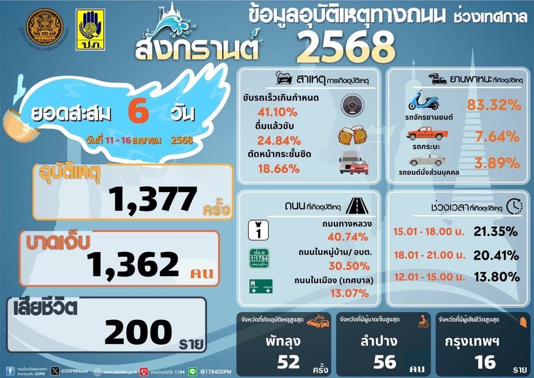 สำหรับข้อมูลอุบัติเหตุทางถนนช่วงเทศกาลสงกรานต์ พ.ศ. 2568 ประจำวันที่ 16 เมษายน 2568 ซึ่งเป็นวันที่หกของการรณรงค์ “ขับขี่ปลอดภัย เมืองไทยไร้อุบัติเหตุ” ศูนย์อำนวยการป้องกันและลดอุบัติเหตุทางถนนช่วงเทศกาลสงกรานต์ พ.ศ. 2568 โดยกรมป้องกันและบรรเทาสาธารณภัยและความร่วมมือของหน่วยงานภาคีเครือข่ายได้รวบรวมสถิติอุบัติเหตุทางถนนประจำวันที่ 16 เมษายน 2568 เกิดอุบัติเหตุ 155 ครั้ง ผู้บาดเจ็บ 149 คน ผู้เสียชีวิต 22 ราย สาเหตุที่ทำให้เกิดอุบัติเหตุสูงสุด ได้แก่ ขับรถเร็ว ร้อยละ 39.35 ตัดหน้ากระชั้นชิด ร้อยละ 19.35 และทัศนวิสัยไม่ดี ร้อยละ 18.06 ยานพาหนะที่เกิดอุบัติเหตุสูงสุด ได้แก่ รถจักรยานยนต์ ร้อยละ 83.76 ส่วนใหญ่เกิดบนเส้นทางตรง ร้อยละ 82.58 ถนนกรมทางหลวง ร้อยละ 37.42 ถนนในอบต./หมู่บ้าน ร้อยละ 32.90 ถนนในเมือง (เทศบาล) ร้อยละ 15.48 ช่วงเวลาที่เกิดอุบัติเหตุสูงสุด ได้แก่ เวลา 15.01 -18.00 น. ร้อยละ 21.29 เวลา 18.01 – 21.00 น. ร้อยละ 17.42 และเวลา 12.01 – 15.00 น. ร้อยละ 14.19 ผู้บาดเจ็บและเสียชีวิตสูงสุดอยู่ในช่วงอายุ 20-29 ปี ร้อยละ 16.96 จัดตั้งจุดตรวจหลัก 1,754 จุด เจ้าหน้าที่ปฏิบัติงาน 50,860 คน โดยจังหวัดที่เกิดอุบัติเหตุสูงสุด ได้แก่ ลำปาง (9 ครั้ง) จังหวัดที่มีผู้บาดเจ็บสูงสุด ได้แก่ ลำปาง (9 คน) จังหวัดที่มีผู้เสียชีวิตสูงสุด ได้แก่ ขอนแก่น ชัยภูมิ ปทุมธานี อ่างทอง และเพชรบุรี (จังหวัดละ 2 ราย)