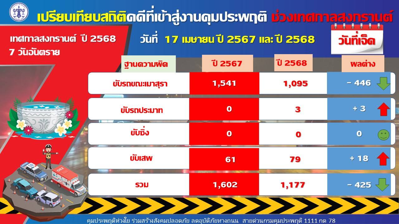 ยอดสะสม 7 วัน (วันที่ 11 – 17 เมษายน 2568) มีจำนวนทั้งสิ้น 6,405 คดี ลดลงจากปี 2567 (7,388 คดี) คิดเป็น 12.63% แบ่งเป็น ขับรถขณะเมาสุรา 6,100 คดี คิดเป็นร้อยละ 95.27 ขับรถประมาท 6 คดี คิดเป็นร้อยละ 0.09 ขับซิ่ง 2 คดี คิดเป็นร้อยละ 0.03 และขับเสพ 297 คดี คิดเป็นร้อยละ 4.64