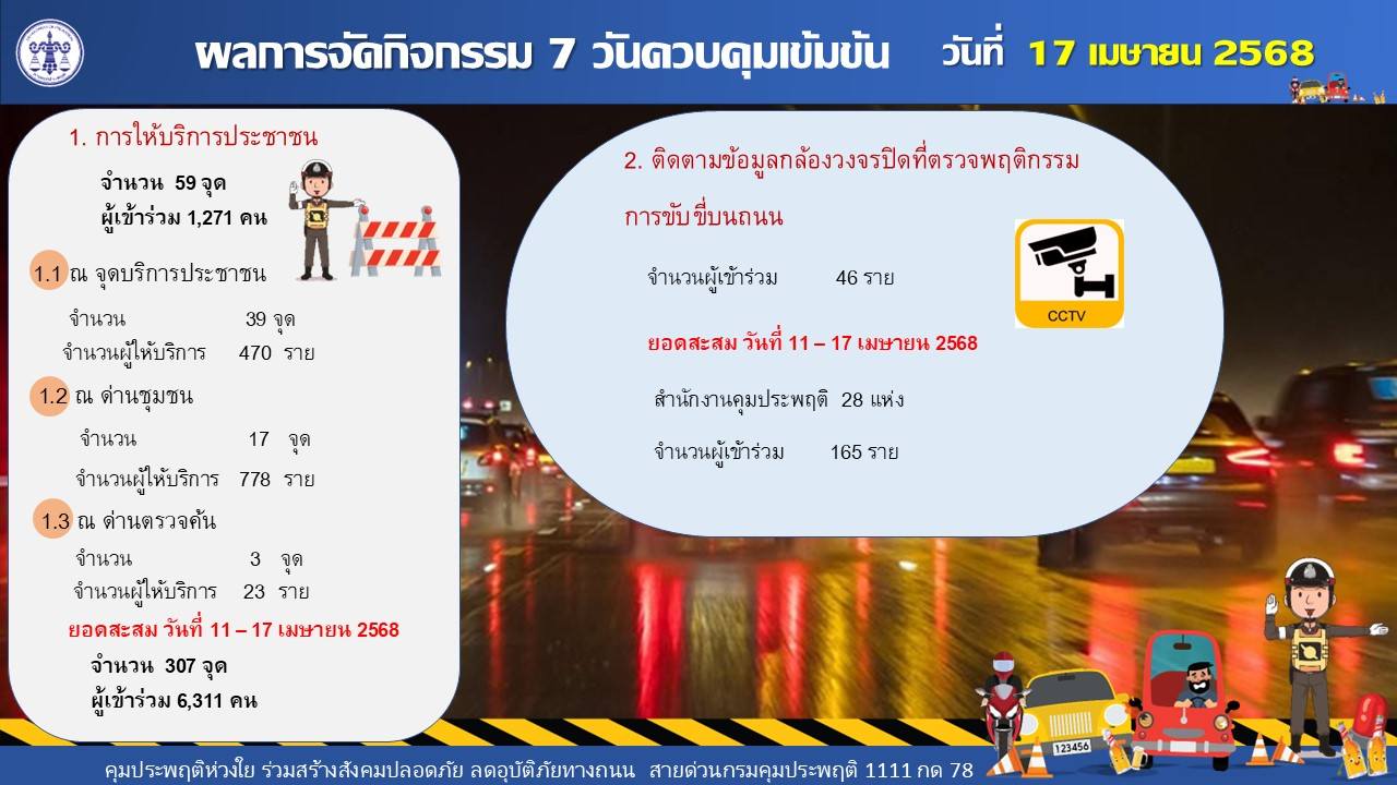 สำหรับในช่วง 7 วันที่มีการควบคุมเข้มข้น สำนักงานคุมประพฤติทั่วประเทศ ได้ร่วมสนับสนุนการปฏิบัติงานของเจ้าหน้าที่ในการให้บริการประชาชนตามสถานที่ต่างๆ โดยให้บริการประชาชนแจกน้ำดื่ม ผ้าเย็น เครื่องดื่ม อำนวยความสะดวกจราจร ที่จุดบริการประชาชน ด่านชุมชน และด่านตรวจค้น รวมทั้งสิ้นจำนวน 307 จุด ผู้เข้าร่วมกิจกรรมประกอบด้วย อาสาสมัครคุมประพฤติ ผู้ถูกคุมความประพฤติ ภาคีเครือข่าย และประชาชน จำนวนทั้งสิ้น 6,311 คน และกิจกรรมร่วมสังเกตพฤติกรรมการขับขี่ผ่านกล้องวงจรปิด (CCTV) แบบเรียลไทม์ โดยสำนักงานคุมประพฤติ 28 แห่ง ได้นำผู้ถูกคุมประพฤติเข้าร่วมกิจกรรมรวมจำนวน 165 ราย