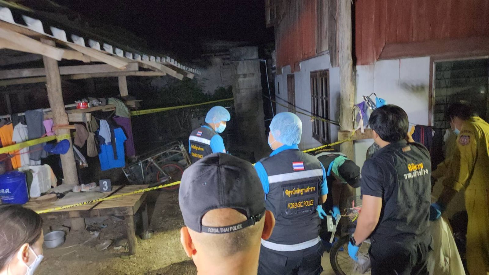 ที่เกิดเหตุบริเวณหลังบ้าน พบศพชาย อายุ 35 ปี นอนคว่ำหน้าเสียชีวิต สภาพตามร่างกายมีร่องรอยถูกยิงด้วยอาวุธปืน โดยเฉพาะที่หน้าอกและลำตัว นอกจากนี้ยังมีบาดแผลจากของมีคมบริเวณศีรษะ ใกล้กันพบมีดดายหญ้ายาวกว่า 1 ฟุตตกอยู่ และพบลำกล้องปืนแก๊บยาวตกอยู่ในสภาพหัก