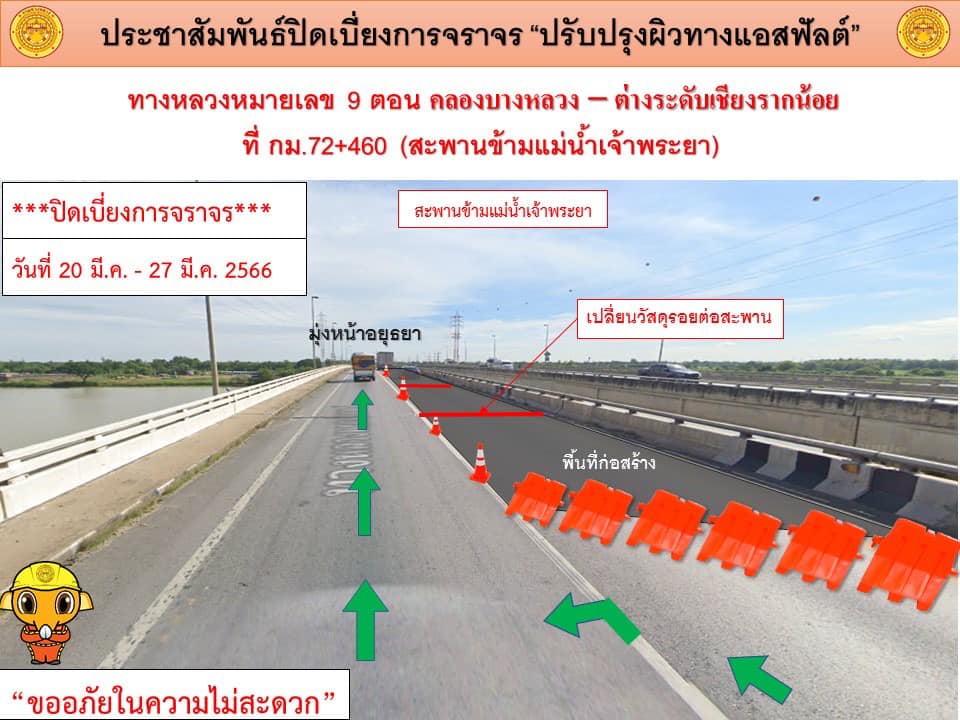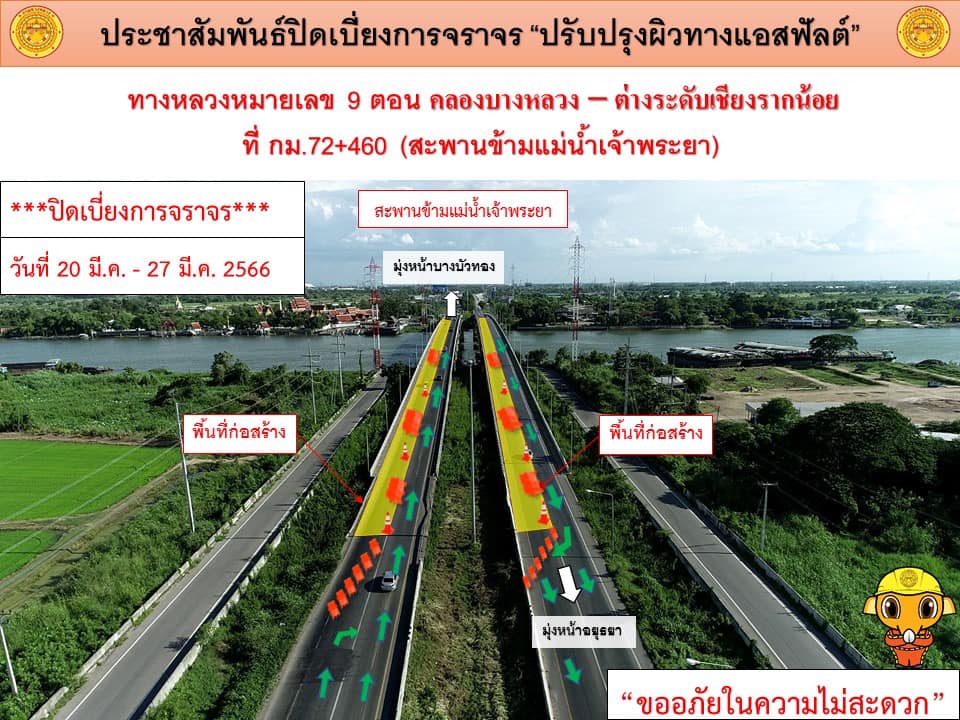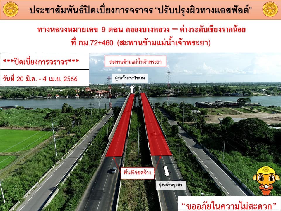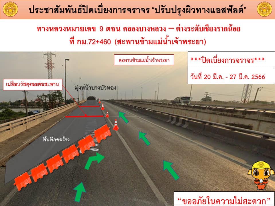 แขวงทางหลวงปทุมธานี แจ้งประชาสัมพันธ์ ปิดเบี่ยงการจราจร ปรับปรุงผิวแอสฟัลต์ ในทางหลวงหมายเลข 9 (กาญจนาภิเษกฝั่งตะวันตก) ตอน คลองบางหลวง – ต่างระดับเชียงรากน้อย ที่กม.72+460 สะพานข้ามแม่น้ำเจ้าพระยา (ด้านขวาทางและด้านซ้ายทาง) ระหว่างวันที่ 20 มีนาคม 2566 - วันที่ 4 เมษายน 2566 (งานซ่อมรอยต่อสะพาน)