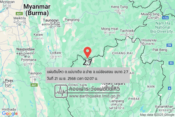 วันที่ 21 เม.ย. 2568 เวลา 02.07 น. กองเฝ้าระวังแผ่นดินไหว กรมอุตุนิยมวิทยา แจ้งว่า เกิดเหตุแผ่นดินไหว ขนาด 2.7 ความลึก 5 กม. ภายในพื้นที่ของ ต.แม่นาเติง อ.ปาย จ.แม่ฮ่องสอน (19.68°N,98.42°E) ยังไม่มีรายงานผลกระทบจากแรงสั่นสะเทือน
