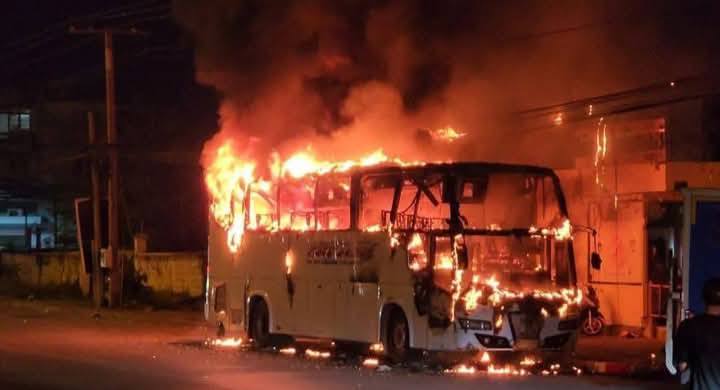 ในที่เกิดเหตุพบ แสงเพลิงกำลังลุกไหม้ รถบัสรับส่งพนักงานสีขาว ป้ายเหลือง หมวดจังหวัดลพบุรี เจ้าหน้าที่รถดับเพลิงของ อบต.คานหาม จำนวน 2 คัน ใช้น้ำฉีดสกัดเพลิงที่ลุกไหม้รถบัส เพื่อไม่ให้ลุกลามไปติดร้านค้าที่อยู่ใกล้เคียง และยังพบเสียงระเบิดดังขึ้น 1 ครั้ง ใช้เวลากว่า 30 นาที แสงเพลิงจึงสงบ เหลือแต่กลุ่มควันเบื้องต้นรถบัสถูกไฟไหม้เสียหายทั้งคัน