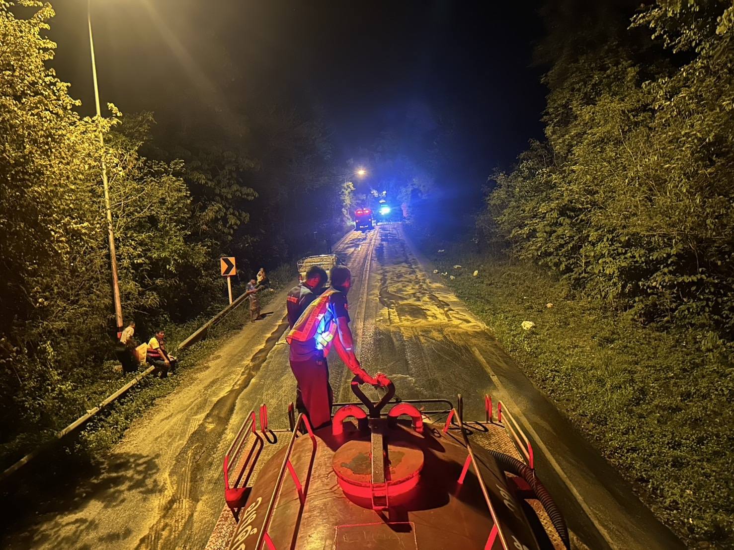 เจ้าหน้าที่กำลังกำจัดคราบน้ำมันบนผิวจราจร ถนนหมายเลข 348 บนเขาช่องตะโก เพื่อนำรถเครนขึ้นไปยกรถที่ล้มกีดขวาง