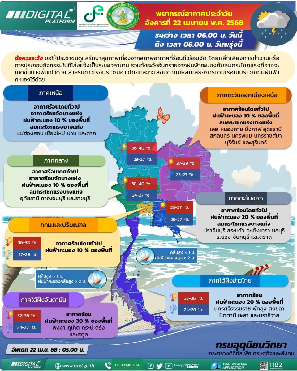 ลักษณะอากาศทั่วไป พยากรณ์อากาศ 24 ชั่วโมงข้างหน้า ประเทศไทยมีอากาศร้อนโดยทั่วไป และมีอากาศร้อนจัดบางพื้นที่ในภาคเหนือและภาคกลาง โดยมีฝนฟ้าคะนองกับมีลมกระโชกแรงบางแห่ง ขอให้ประชาชนในบริเวณดังกล่าวดูแลรักษาสุขภาพเนื่องจากสภาพอากาศที่ร้อนถึงร้อนจัด โดยหลีกเลี่ยงการทำงานหรือการประกอบกิจกรรมในที่โล่งแจ้งเป็นระยะเวลานาน รวมทั้งระวังอันตรายจากฝนฟ้าคะนองกับลมกระโชกแรงที่อาจจะเกิดขึ้นบางพื้นที่ไว้ด้วย ทั้งนี้เนื่องจากความกดอากาศต่ำเนื่องจากความร้อนปกคลุมประเทศไทยตอนบน ในขณะที่มีลมใต้และลมตะวันตกเฉียงใต้พัดปกคลุมในบริเวณดังกล่าว