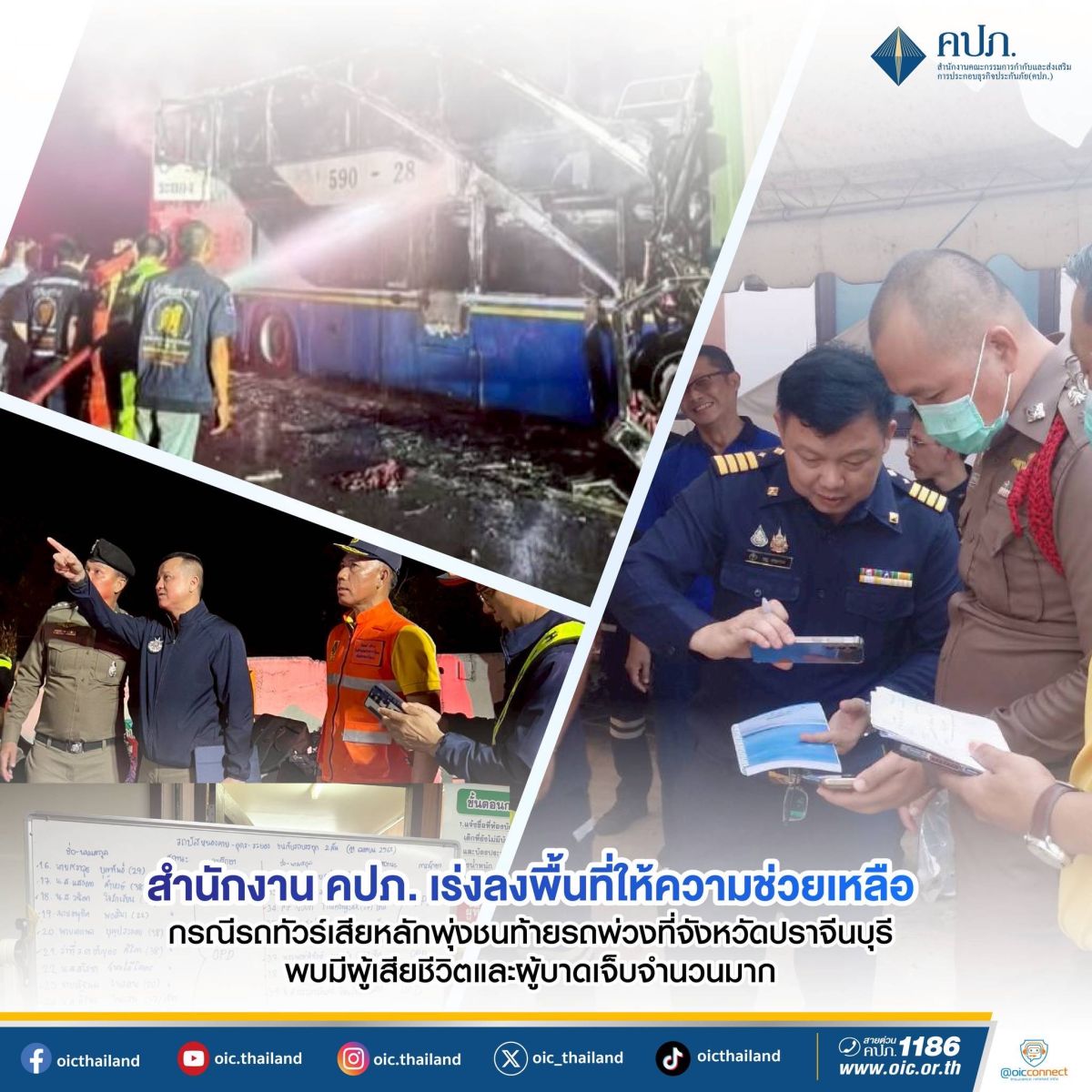 วันที่ 21 เมษายน 2568 สำนักงานคณะกรรมการกำกับและส่งเสริมการประกอบธุรกิจประกันภัย (สำนักงาน คปภ.) โดยสายส่งเสริมและประกันภัยภูมิภาค สำนักงาน คปภ. ภาค 4 (นครราชสีมา) และสำนักงาน คปภ. จังหวัดนครนายก ในฐานะเจ้าของพื้นที่รับผิดชอบ ได้ลงพื้นที่ทันทีเพื่อตรวจสอบ กรณีรถบัสโดยสารประจำทางของบริษัท 407 พัฒนา หมายเลขทะเบียน 10-7125 อุดรธานี เกิดอุบัติเหตุเสียหลักพุ่งชนรถพ่วง 18 ล้อ บริเวณทางหลวงหมายเลข 304 ตำบลบุพราหมณ์ อำเภอนาดี จังหวัดปราจีนบุรี ใกล้เคียง ศาลเจ้าพ่อปู่โทน เป็นเหตุให้เกิดไฟลุกไหม้ตัวรถโดยสารอย่างรวดเร็ว เบื้องต้นพบว่ามีผู้เสียชีวิต 7 ราย และบาดเจ็บกว่า 40 ราย พร้อมทั้งตรวจสอบข้อมูลการทำประกันภัย และติดตามรายงานความเสียหายอย่างเร่งด่วนผ่าน Platform การรายงานข้อมูล กรณีอุบัติภัยกลุ่มหรือรายใหญ่ด้วยระบบอิเล็กทรอนิกส์ รวมทั้งลงพื้นที่เพื่ออำนวยความสะดวกด้านประกันภัยให้กับครอบครัว ของผู้ประสบภัยอย่างเต็มที่ เพื่อให้ระบบประกันภัยช่วยบรรเทาความเดือดร้อนให้กับครอบครัวของผู้เสียชีวิตและผู้บาดเจ็บได้อย่าง มีประสิทธิภาพ รวดเร็ว และเป็นธรรม