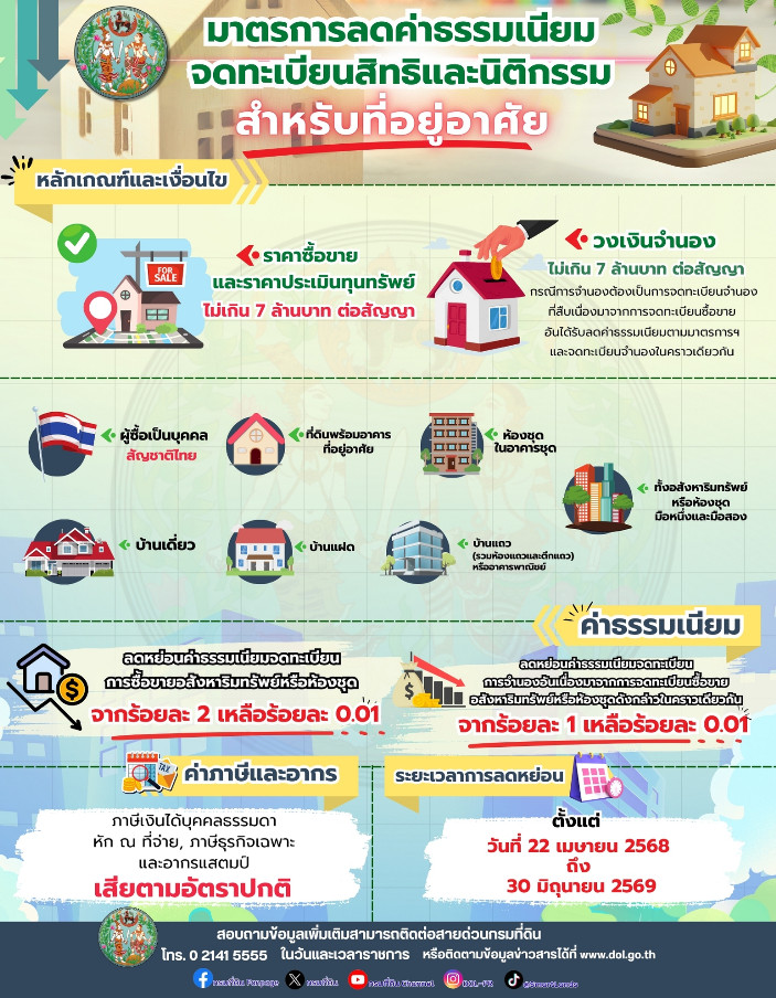 ตามที่คณะรัฐมนตรีมีมติ เมื่อวันที่ 8 เมษายน 2568 กำหนดหลักเกณฑ์ให้ลดหย่อน การเรียกเก็บค่าธรรมเนียมจดทะเบียนสิทธิและนิติกรรมตามประมวลกฎหมายที่ดิน และตามกฎหมายว่าด้วยอาคารชุด ในการโอนและการจำนองอสังหาริมทรัพย์ที่เป็นอาคารที่อยู่อาศัยหรืออาคารพาณิชย์ หรือที่ดินพร้อมอาคารดังกล่าว หรือห้องชุด สำหรับผู้ซื้ออสังหาริมทรัพย์ หรือห้องชุด ราคาไม่เกิน 7 ล้านบาทเป็นพิเศษ โดยให้รัฐมนตรีว่าการกระทรวงมหาดไทย ออกประกาศไว้
