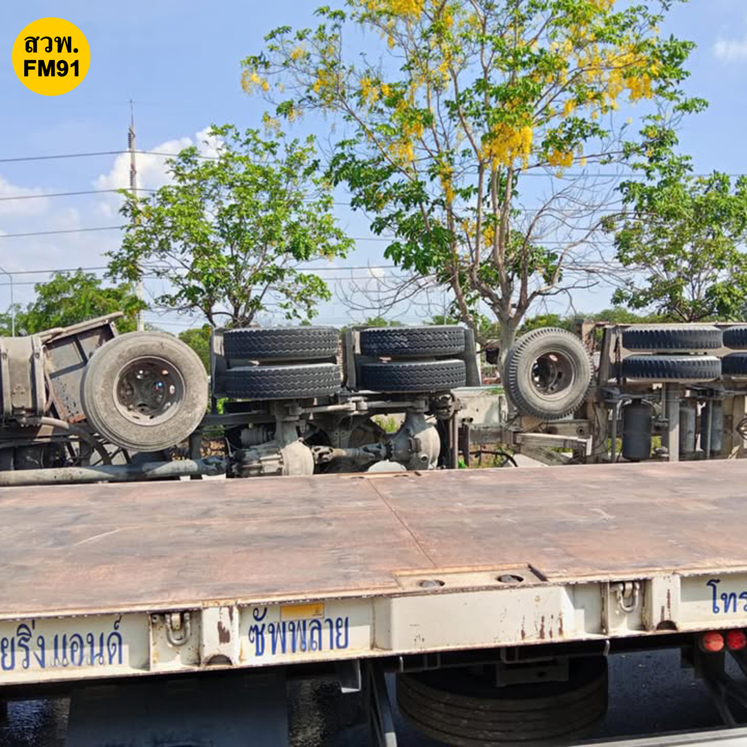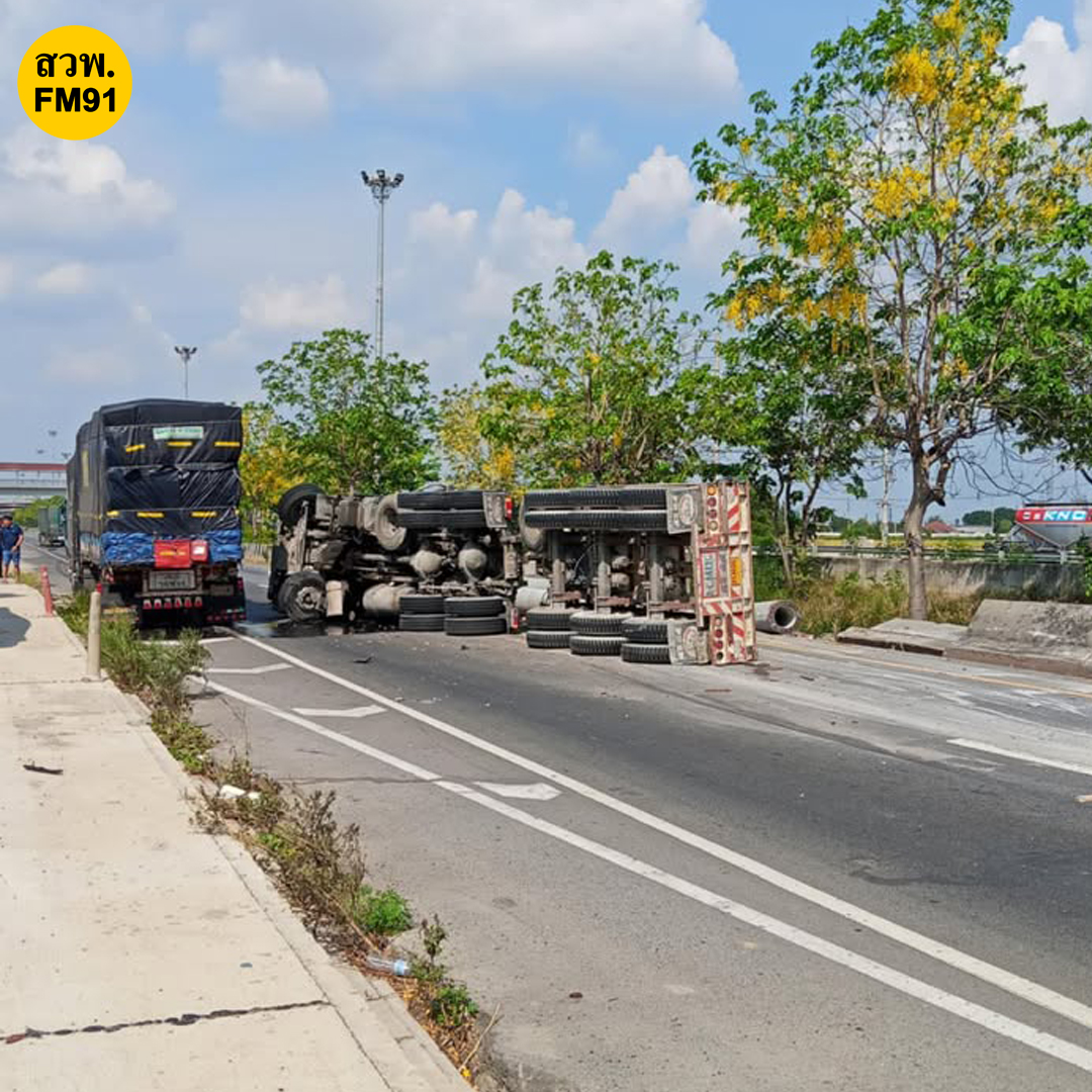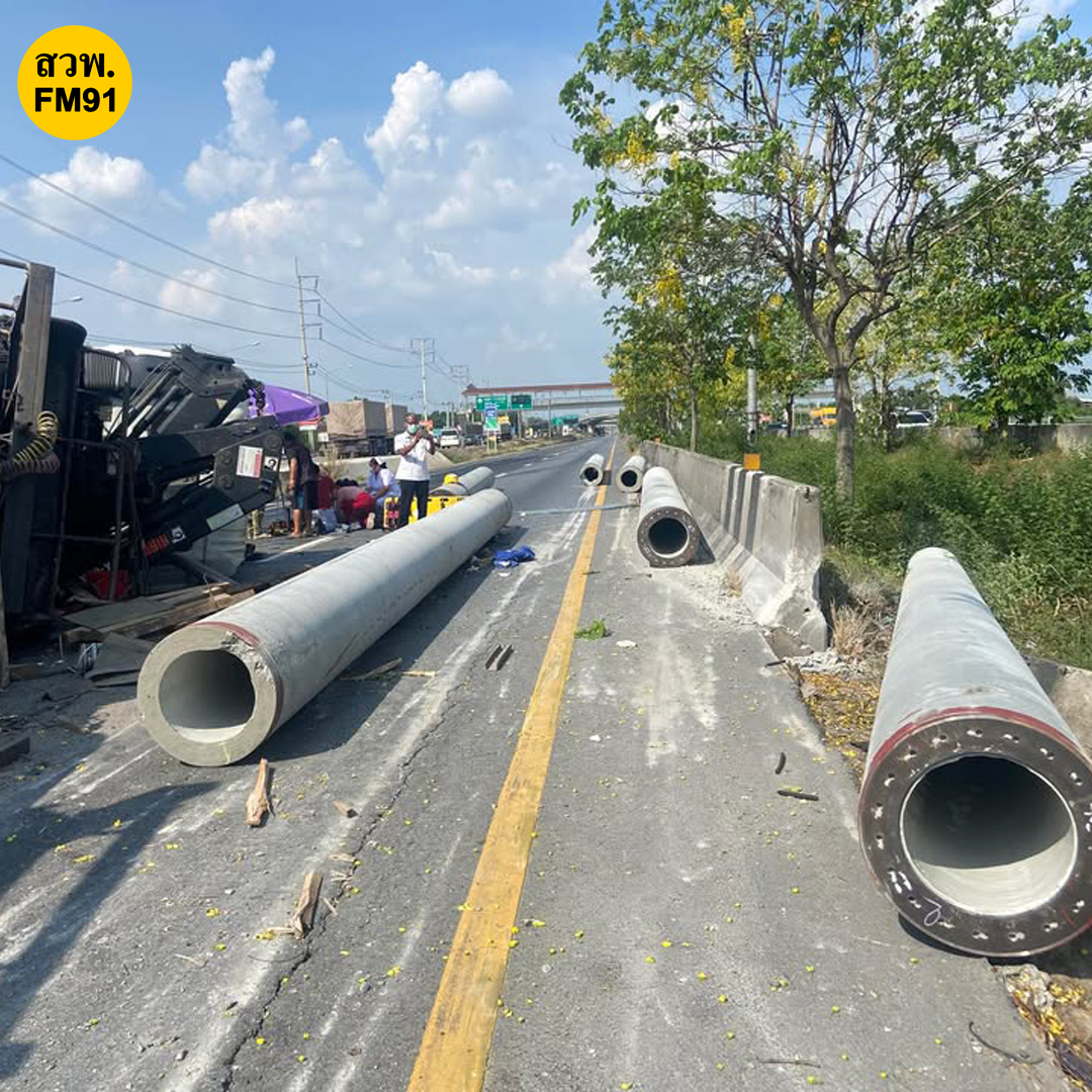 หน้าปั้มปตท. (กม.77) อ.บางปะอิน จ.อยุธยา รถบรรทุกเสาเข็มพลิกตะแคง อยู่ระหว่างเคลื่อนย้าย
