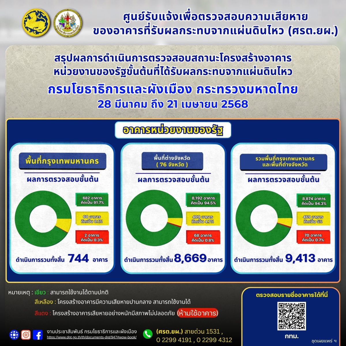 สรุป ดำเนินการตรวจสอบอาคารภาครัฐ สะสมตั้งแต่ วันที่ 28 มีนาคม – 21 เมษายน 2568 จำนวน 262 หน่วยงาน จำนวน 744 อาคาร สามารถใช้งานได้ปกติ สีเขียว จำนวน 682 อาคาร / มีความเสียหายปานกลาง สามารถใช้งานได้ สีเหลือง จำนวน 60 อาคาร / โครงสร้างมีความเสียหายอย่างหนักโดยได้สั่งให้ระงับการใช้งานอาคาร สีแดง จำนวน 2 อาคาร
