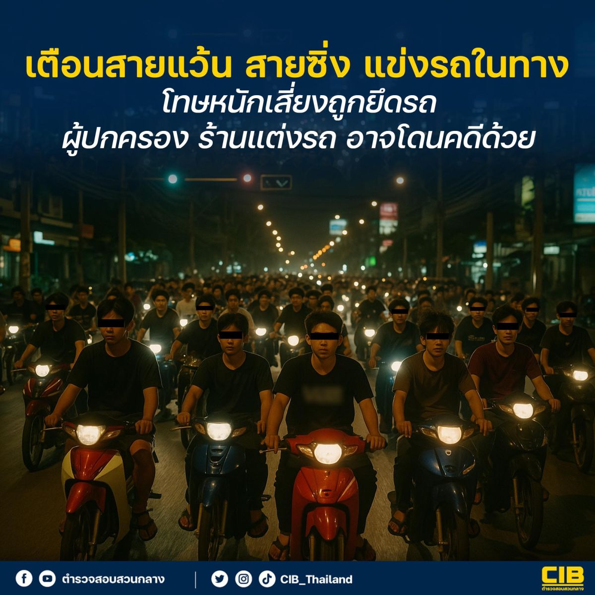 สายเเว้น สายซิ่ง ก่อนจะบิด ก่อนจะเหยียบคันเร่ง ฟังทางนี้ก่อน ตำรวจสอบสวนกลาง (CIB) ขอเตือน การแข่งรถในทางสาธารณะโดยไม่ได้รับอนุญาต ถือเป็นการกระทำที่ผิดกฎหมาย โทษหนักถึงขั้นจำคุก และนอกจากตัวผู้เเข่งรถเเล้ว ผู้ที่มีส่วนเกี่ยวข้องกับการแข่งรถ ยังมีส่วนที่จะต้องรับผิดตามกฎหมายอีกด้วย