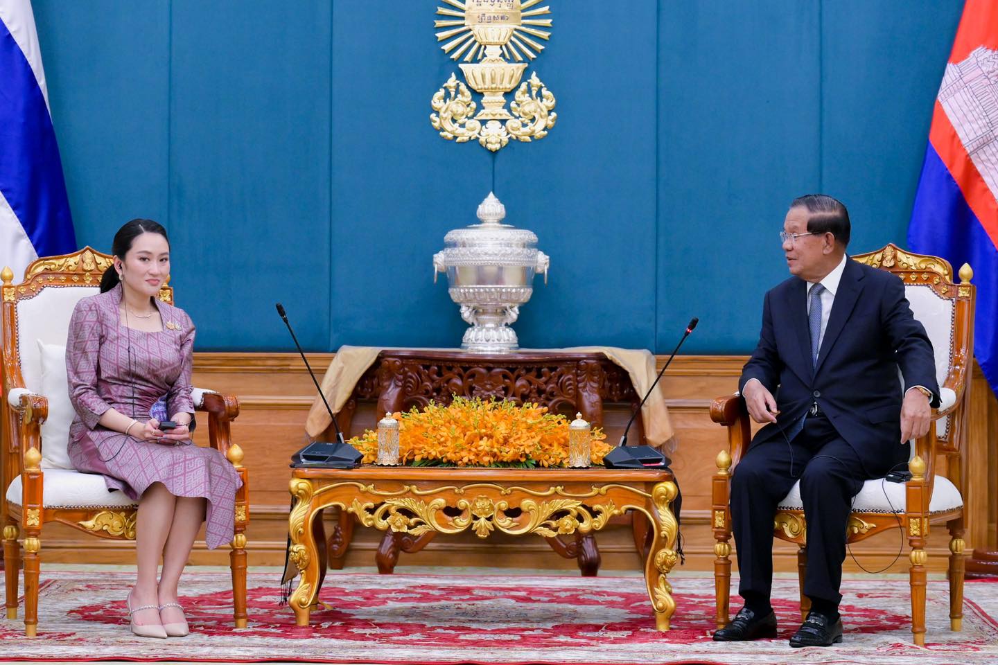 (วันที่ 23 เมษายน 2568) เวลา 16.00 น. (ตามเวลาท้องถิ่นกรุงพนมเปญ ซึ่งเท่ากับกรุงเทพฯ) ณ วุฒิสภาราชอาณาจักรกัมพูชา (Senate House) นางสาวแพทองธาร ชินวัตร นายกรัฐมนตรี เข้าเยี่ยมคารวะสมเด็จอัคคมหาเสนาบดีเดโช ฮุน เซน (Samdech Akka Moha Sena Padei Techo HUN SEN) ประธานวุฒิสภาและประธานองคมนตรีแห่งราชอาณาจักรกัมพูชา