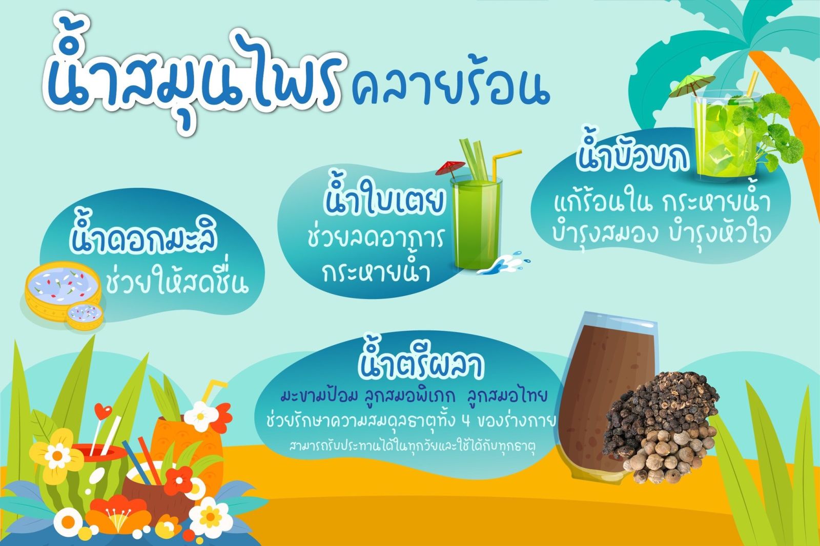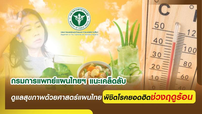 กรมการแพทย์แผนไทยและการแพทย์ทางเลือก แนะเคล็ดลับการดูแลสุขภาพ ด้วยศาสตร์แผนไทย เผย 7 ยาสมุนไพร ที่ควรมีติดบ้าน ติดตัว เช่น ยาหอมเทพจิตร ยาหอมทิพโอสถ ยาดมสมุนไพร โลชั่นพญายอ ว่านหางจระเข้ แตงกวา และ พญายอกลีเซอรีน พร้อมชูเมนูอาหาร นำสมุนไพรช่วยบำรุงร่างกาย และเหมาะสำหรับรับประทานในช่วงฤดูร้อน เช่น มะระทรงเครื่อง แกงเลียงกุ้ง น้ำดอกมะลิ น้ำบัวบก น้ำใบเตย และ น้ำตรีผลา ช่วยบรรเทาอาการเจ็บป่วย ห่างไกลโรคช่วงฤดูร้อน