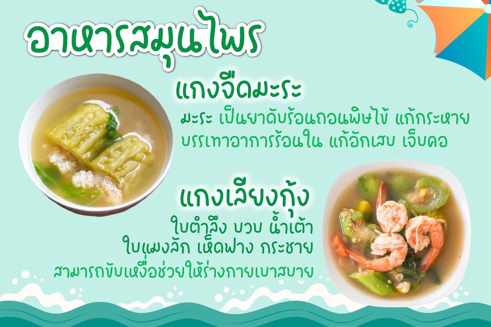 ในช่วงฤดูร้อน ควรรับประทานพืชผักสมุนไพรที่มีฤทธิ์เย็นเป็นหลัก สำหรับเมนูอาหารและน้ำสมุนไพรคลายร้อนที่แนะนำ ได้แก่ มะระทรงเครื่อง มะระมีสรรพคุณที่สำคัญ คือ เป็นยาดับร้อนถอนพิษไข้ แก้กระหาย บรรเทาอาการร้อนใน แก้อักเสบ เจ็บคอ แกงเลียงกุ้ง อาหารพื้นบ้านที่ประกอบด้วยผักต่างๆ เช่น ใบตำลึง ใบแมงลัก บวบ น้ำเต้า เห็ดฟาง กระชาย ผักเหล่านี้เป็นผักที่มีประโยชน์ต่อร่างกาย แกงเลียงกุ้งร้อนๆ สามารถขับเหงื่อช่วยให้ร่างกาย เบาสบาย และเครื่องดื่มสมุนไพรที่แนะนำ อาทิ น้ำดอกมะลิ ช่วยให้สดชื่น น้ำบัวบก แก้ร้อนใน กระหายน้ำ บำรุงสมอง บำรุงหัวใจ น้ำใบเตย ช่วยลดอาการกระหายน้ำ และ น้ำตรีผลา ประกอบด้วยผลไม้ 3 ชนิด ได้แก่ มะขามป้อม ลูกสมอพิเภก ลูกสมอไทย เป็นยาปรับธาตุในหน้าร้อน มีสรรพคุณช่วยรักษาความสมดุลธาตุทั้ง 4 ของร่างกาย สามารถรับประทานได้ในทุกวัยและใช้ได้กับทุกธาตุ