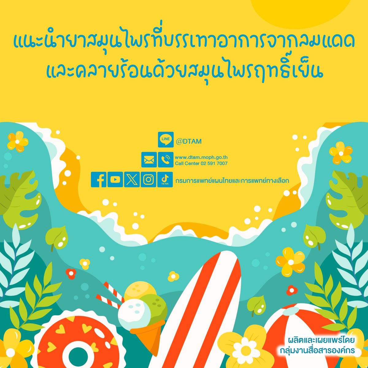 วันที่ 24 เมษายน 2568 นายแพทย์สมฤกษ์ จึงสมาน อธิบดีกรมการแพทย์แผนไทยและการแพทย์ทางเลือก กล่าวว่า ขณะนี้ประเทศไทยเข้าสู่ ฤดูร้อนแล้ว ตามศาสตร์การแพทย์แผนไทย ในช่วงฤดูร้อน หรือคิมหันตฤดูนี้ อาการเจ็บป่วย ของประชาชนส่วนใหญ่ ที่มักพบ ได้แก่ ปวดศีรษะ วิงเวียนศีรษะ ผด ผื่น คัน ร้อนใน ท้องเสีย ท้องผูก กรดไหลย้อน เป็นสิว ทั้งนี้ขอแนะนำ 7 ยาสมุนไพร ที่ควรมีติดบ้าน ติดตัว เช่น ยาหอมเทพจิตร ยาหอมทิพโอสถ ยาดมสมุนไพร โลชั่นพญายอ ว่านหางจระเข้ แตงกวา และ พญายอกลีเซอรีน รวมถึงเมนูอาหาร และน้ำสมุนไพรที่ช่วยบำรุงร่างกาย เช่น มะระทรงเครื่อง แกงเลียงกุ้ง น้ำดอกมะลิ น้ำบัวบก น้ำใบเตย และ น้ำตรีผลา และที่สำคัญควรหลีกเลี่ยงการอยู่กลางแดดเป็นเวลานาน และหากจำเป็นต้องออกแดด ควรสวมหมวก หรือกางร่ม ดื่มน้ำสะอาดให้เพียงพอ วันละ 6-8 แก้ว เพื่อลดความเสี่ยงของภาวะขาดน้ำ ก็จะช่วยบรรเทาอาการเจ็บป่วย ห่างไกลโรคในช่วงฤดูร้อนได้