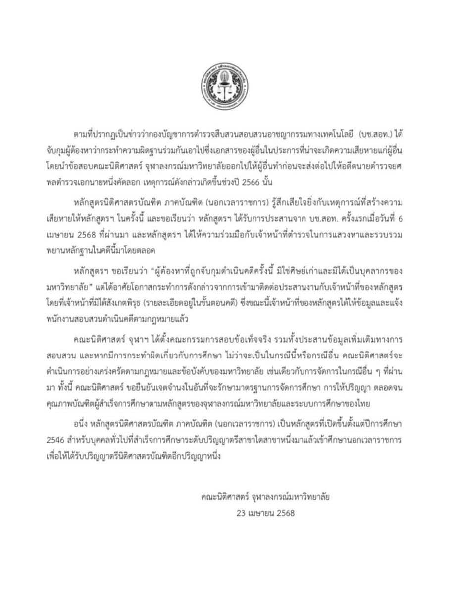 หลักสูตรนิติศาสตรบัณฑิต ภาคบัณฑิต (นอกเวลาราชการ) รู้สึกเสียใจยิ่งกับเหตุการณ์ที่สร้างความเสียหายให้หลักสูตรฯ ในครั้งนี้ และขอเรียนว่า หลักสูตรฯ ได้รับการประสานจาก บช.สอท. ครั้งแรกเมื่อวันที่ 6 เม.ย. 2568 ที่ผ่านมา และหลักสูตรฯ ได้ให้ความร่วมมือกับเจ้าหน้าที่ตำรวจในการแสวงหาและรวบรวมพยานหลักฐานในคดีนี้มาโดยตลอด