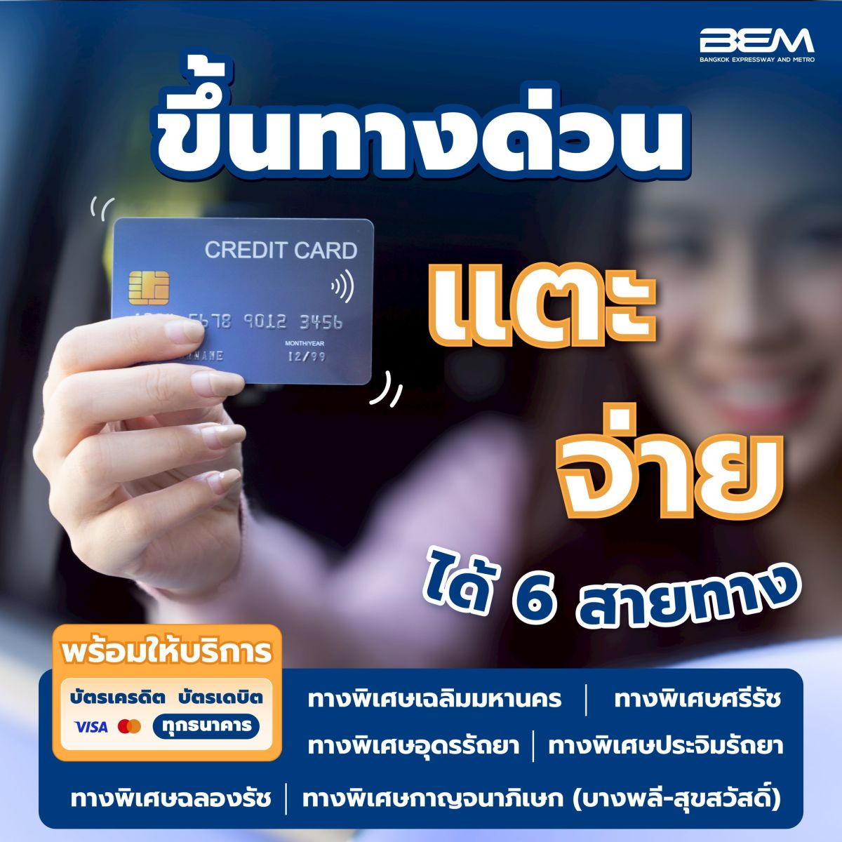 ด้วยเทคโนโลยี EMV ที่ระยะหลังเป็นที่นิยมของผู้ถือบัตรเครดิต เพราะสามารถแตะจ่ายได้อย่างสะดวกรวดเร็วทุกการเดินทาง โดยเฉพาะรถไฟฟ้า MRT สายสีน้ำเงินและสายสีม่วง รวมถึงทางพิเศษซึ่งปัจจุบันเปิดให้บริการแตะจ่ายค่าผ่านทางได้ถึง 6 สายทาง ได้แก่ ทางพิเศษเฉลิมมหานคร, ศรีรัช, อุดรรัถยา, ประจิมรัถยา, ฉลองรัช และกาญจนาภิเษก (บางพลี-สุขสวัสดิ์) บริษัท ทางด่วนและรถไฟฟ้ากรุงเทพ จำกัด (มหาชน) หรือ BEM รวบรวมโปรโมชั่นบัตรเครดิต ฉบับอัพเดตประจำปี 2568 รับเครดิตเงินคืนสูงสุด 10% และสิทธิประโยชน์อีกมากมาย คุ้มค่าการเดินทางเป็นอย่างมาก