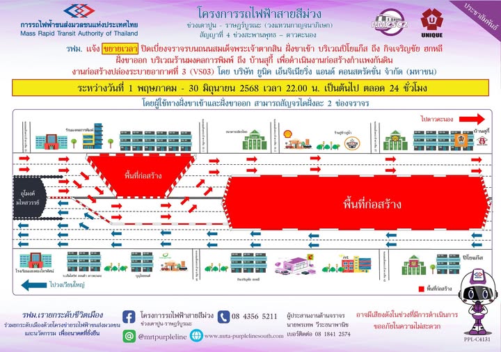 รฟม. แจ้งขยายเวลาปิดเบี่ยงจราจรบนถนนสมเด็จพระเจ้าตากสิน ฝั่งขาเข้า บริเวณปิโยแก๊ส ถึง กิจเจริญชัย ฮกหลี และฝั่งขาออก บริเวณมงคลการพิมพ์ ถึง บ้านสุกี้ เพื่อดำเนินงานก่อสร้างกำแพงกันดิน งานก่อสร้างปล่องระบายอากาศที่ 3 (VS03) โครงการรถไฟฟ้าสายสีม่วง ช่วงเตาปูน - ราษฎร์บูรณะ (วงแหวนกาญจนาภิเษก) ระหว่างวันที่ 1 พฤษภาคม – 30 มิถุนายน 2568 เวลา 22.00 น. เป็นต้นไป ตลอด 24 ชั่วโมง