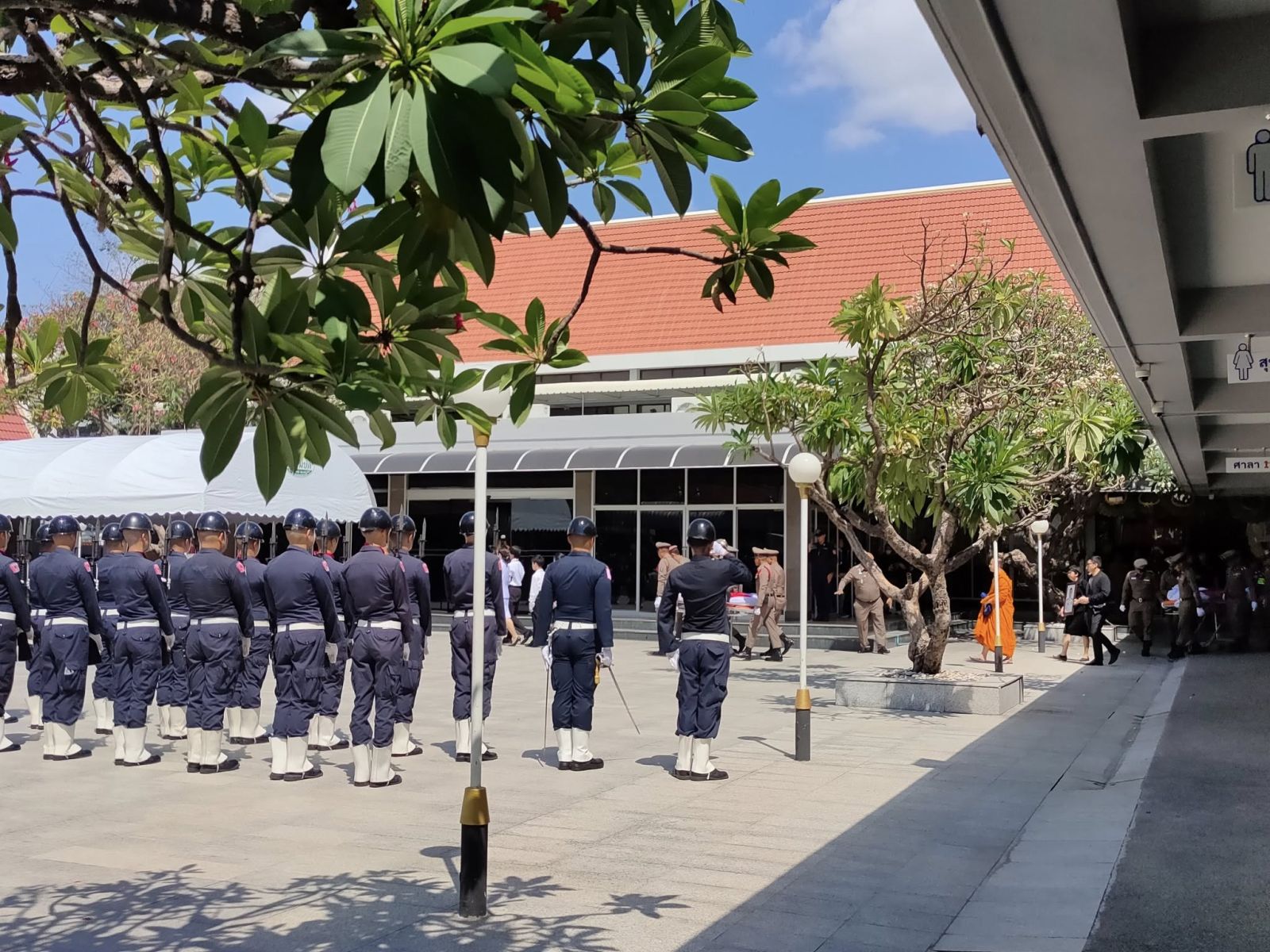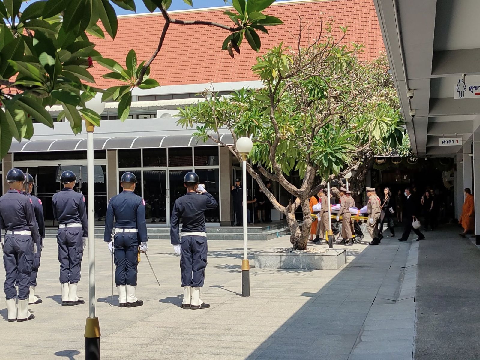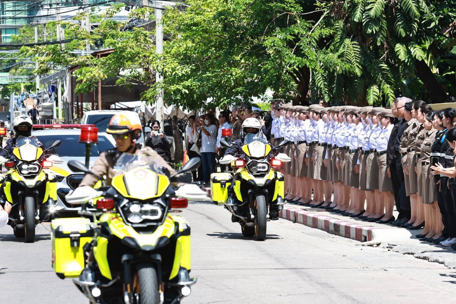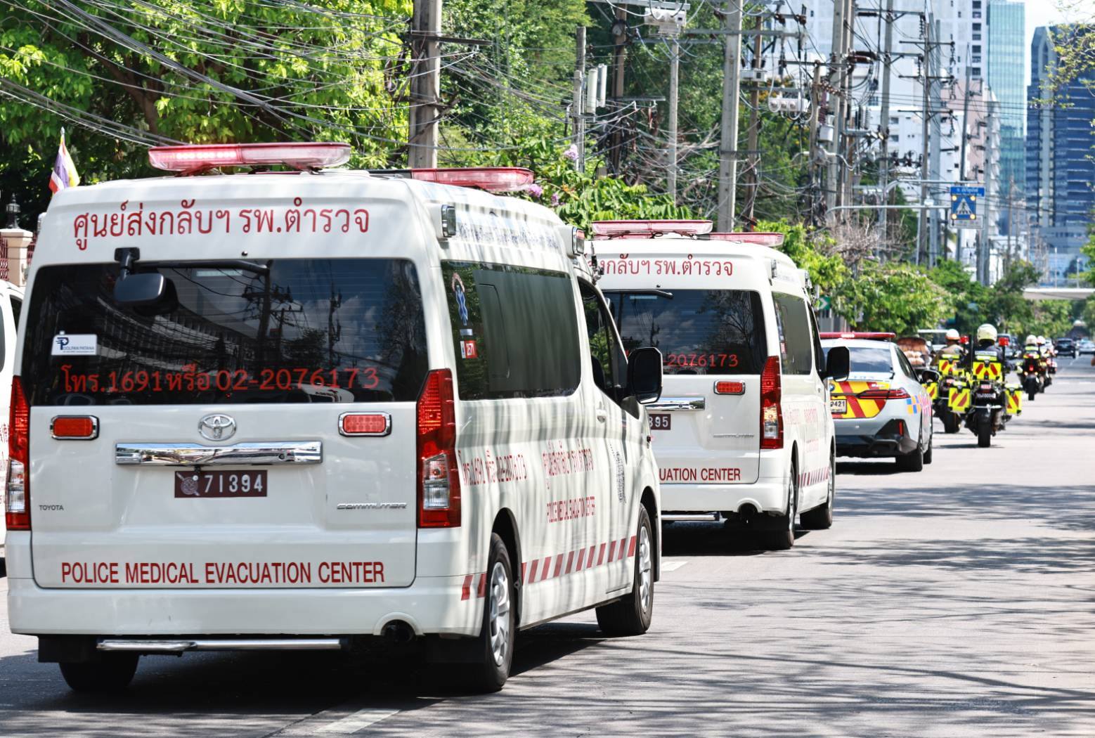 ขณะเดียวกัน เจ้าหน้าที่จัดเตรียมโลงศพมาบรรจุร่าง พร้อมจัดพื้นที่บริเวณด้านข้างของสถาบันนิติเวช เพื่อตั้งขบวนรถเคลื่อนย้ายร่างไปบำเพ็ญกุศล ที่วัดตรีทศเทพวรวิหาร โดยมีรถมอเตอร์ไซต์นำขบวนจากกองบังคับการตำรวจจราจร และตำรวจโครงการพระราชดำริ นำขบวนรถศูนย์ส่งกลับรพ.ตำรวจ จำนวน6คัน ที่บรรจุร่าง 1 ร่างต่อ 1 คัน จากนั้นเป็นรถของตำรวจพื้นที่ปิดท้ายขบวน