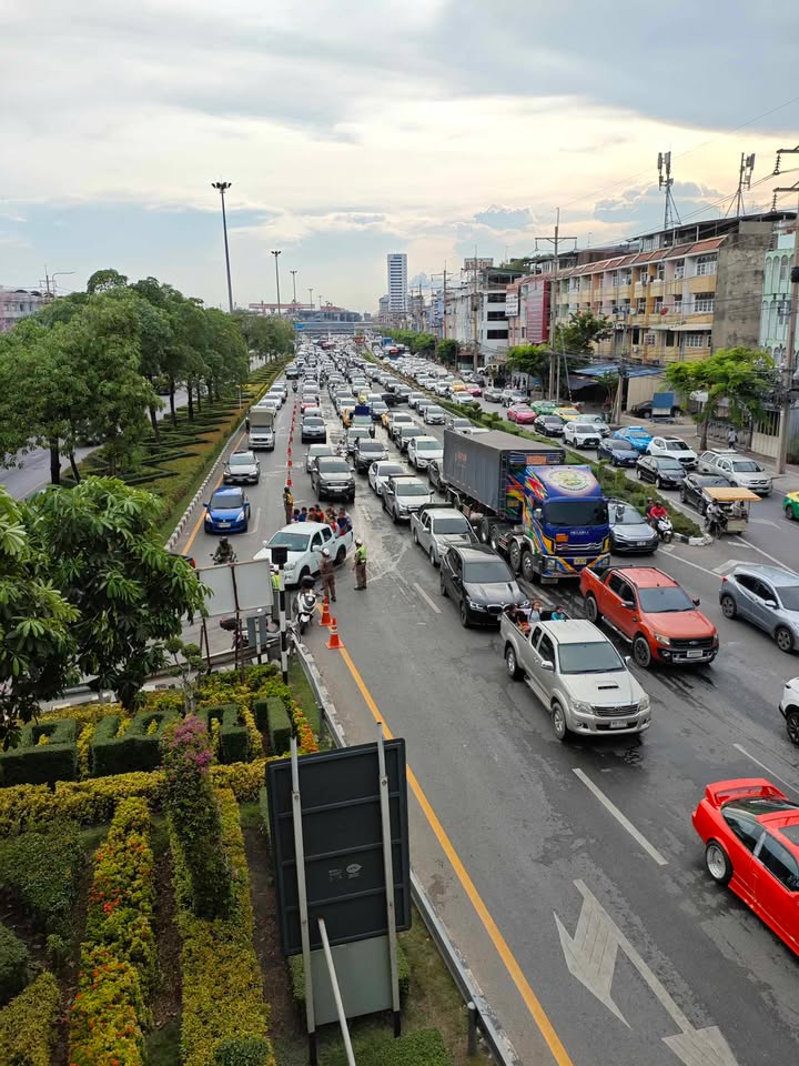 ส่วนถนนพระราม 2 ขาเข้า มุ่งหน้าแยกบางปะแก้ว ก็ติดขัดเช่นกัน ขณะนี้ เจ้าหน้าที่จัดการจราจร ห้ามเลี้ยวขวาไปถนนสุขสวัสดิ์ ขาออก