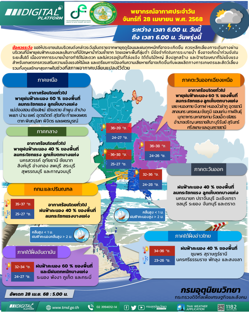 ลักษณะอากาศทั่วไป วันที่ 28 เมษายน 2568 พยากรณ์อากาศ 24 ชั่วโมงข้างหน้า ประเทศไทยตอนบนมีพายุฤดูร้อนเกิดขึ้น โดยมีลักษณะของพายุฝนฟ้าคะนอง กับมีลมกระโชกแรง และลูกเห็บตก รวมถึงฟ้าผ่าที่อาจเกิดขึ้นได้บางพื้นที่ ขอให้ประชาชนในบริเวณดังกล่าวระวังอันตรายจากพายุฤดูร้อนที่อาจจะเกิดขึ้น ควรหลีกเลี่ยงการเดินทางผ่านบริเวณที่มีพายุฝนฟ้าคะนองและเส้นทางที่มีปัญหาน้ำท่วมซ้ำซาก โดยเฉพาะพื้นที่ลุ่มต่ำ มีข้อจำกัดในการระบายน้ำ ซึ่งอาจเกิดน้ำท่วมขังในระยะสั้นได้