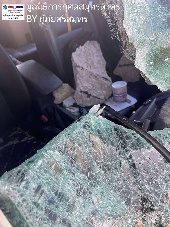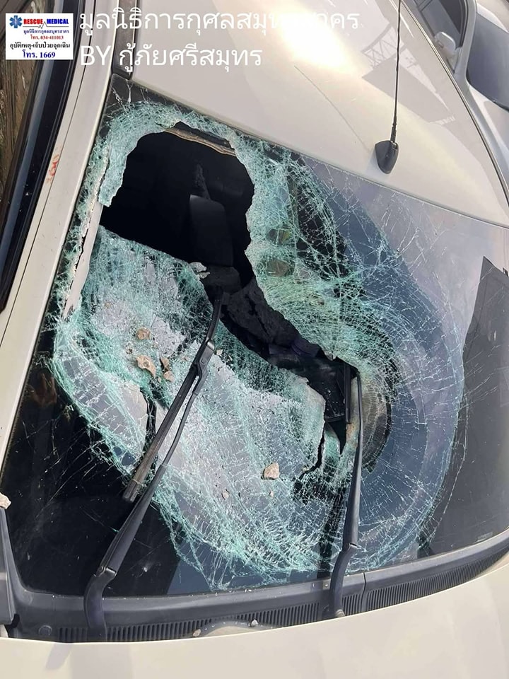 ที่เกิดเหตุพบรถยนต์กระบะ สีขาว จอดชิดขอบทางด้านขวา ตรวจสอบพบกระจกหน้ารถได้รับความเสียหายจากก้อนปูนขนาดใหญ่ที่ตกลงมา ส่วนผู้ขับขี่เป็นชาย 1 ราย ได้รับบาดเจ็บมีบาดแผลฉีกขาดบริเวณใต้คาง
