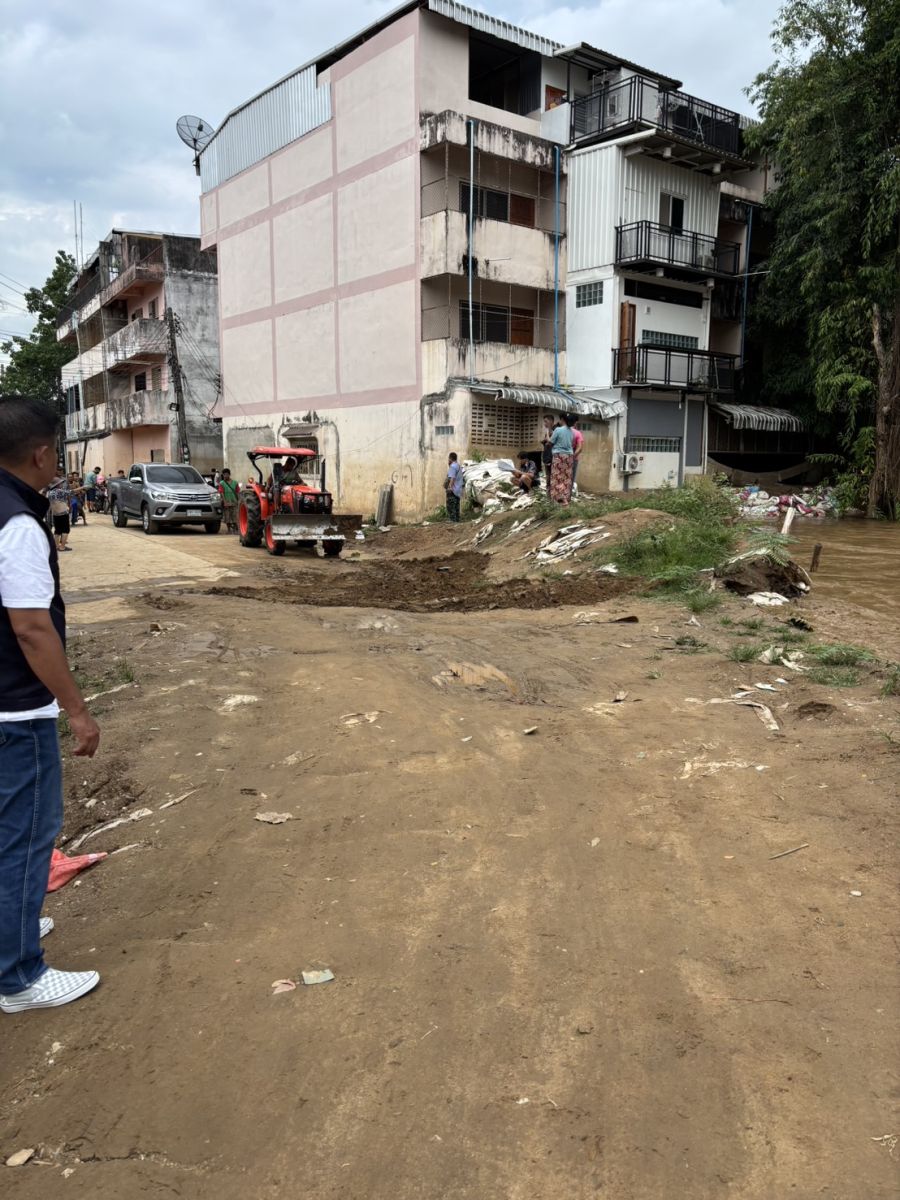 วันที่ 29 เม.ย. 68 เวลาประมาณ 12.00 น. น้ำจากแม่น้ำสาย ทะลักเข้าท่วมร้านค้าตลาดสายลมจอย ชุมชนเกาะทราย ชุมชนไม้ลุงขน อ.แม่สาย จ.เชียงราย พ่อค้าแม่ค้า ประชาชนในพื้นที่นำสิ่งของขึ้นที่สูง ด้านเจ้าหน้าที่กรมการทหารช่าง เร่งนำ Bigbag ชุดใหม่เข้าอุดตามจุดที่น้ำทะลัก