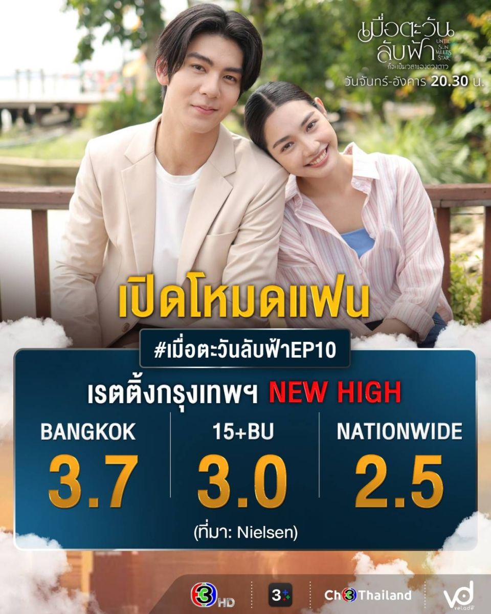 ตามหาคลินิกจัดฟันใกล้ฉันด่วน ๆ งานนี้ ผู้จัดฯ “ตู่ ปิยวดี” เล่นหนัก เสิร์ฟฉากฟินให้คนดูได้ฮ็อบกันจนเหยินกับประโยค "เวลาของผมทั้งหมด...จะเป็นของคุณคนเดียว" ที่ คิมหันต์ (ริว วชิรวิชญ์) พูดกับ นับดาว (มิ้นท์ รัญชน์รวี) ในละคร “เมื่อตะวันลับฟ้าก็จะเป็นเวลาของดวงดาว” ทางช่อง 3 ทำให้ ep10 ฟาดเรตติ้งนิวไฮในพื้นที่กรุงเทพฯ ได้ถึง 3.7 กลุ่มผู้ชมอายุ 15 ปี ขึ้นไป หรือ 15 BU+ (Bangkok and Urban) 3.0 ยอดคนดูสดออนไลน์สูงถึง 196,005 แสนวิว