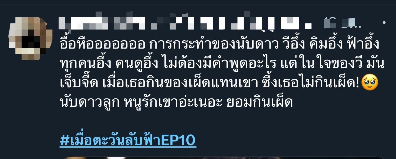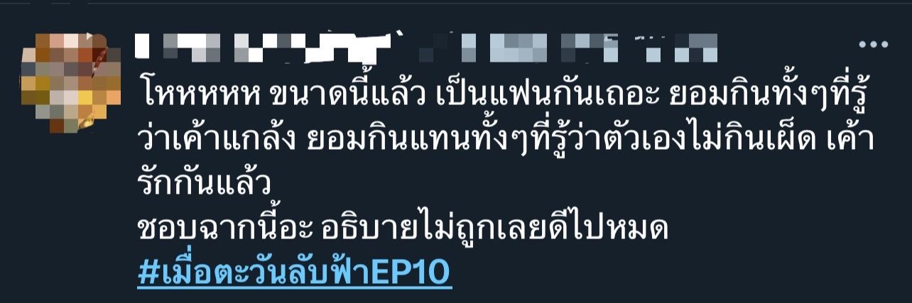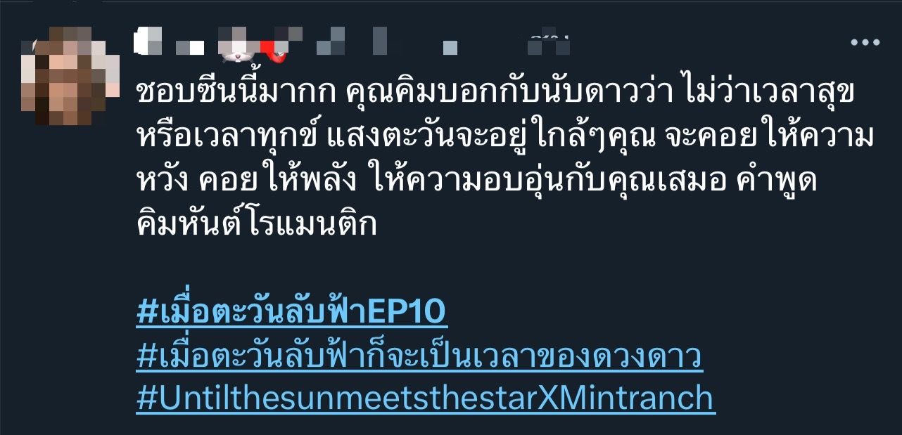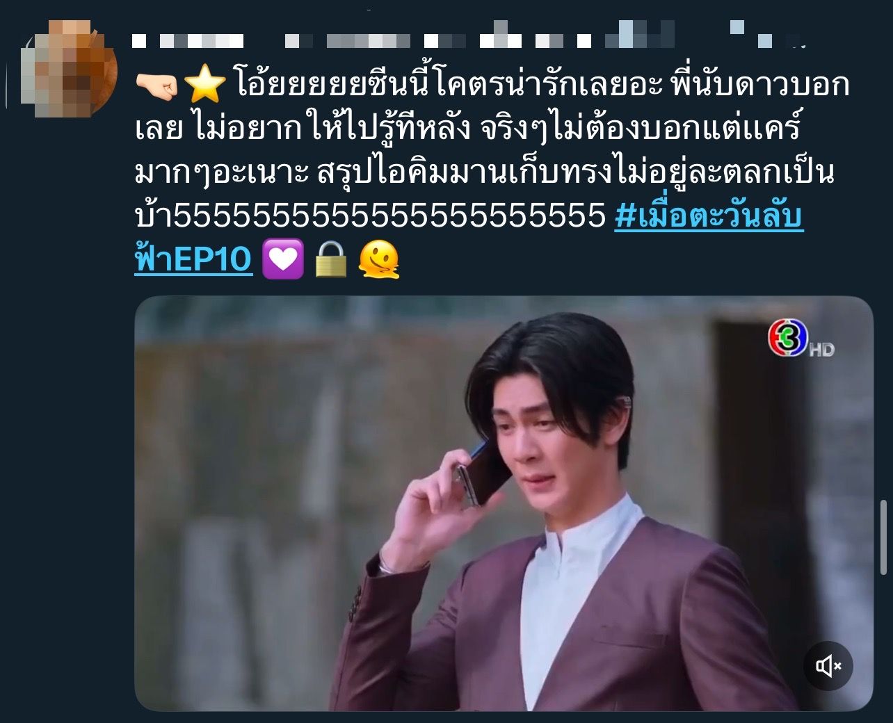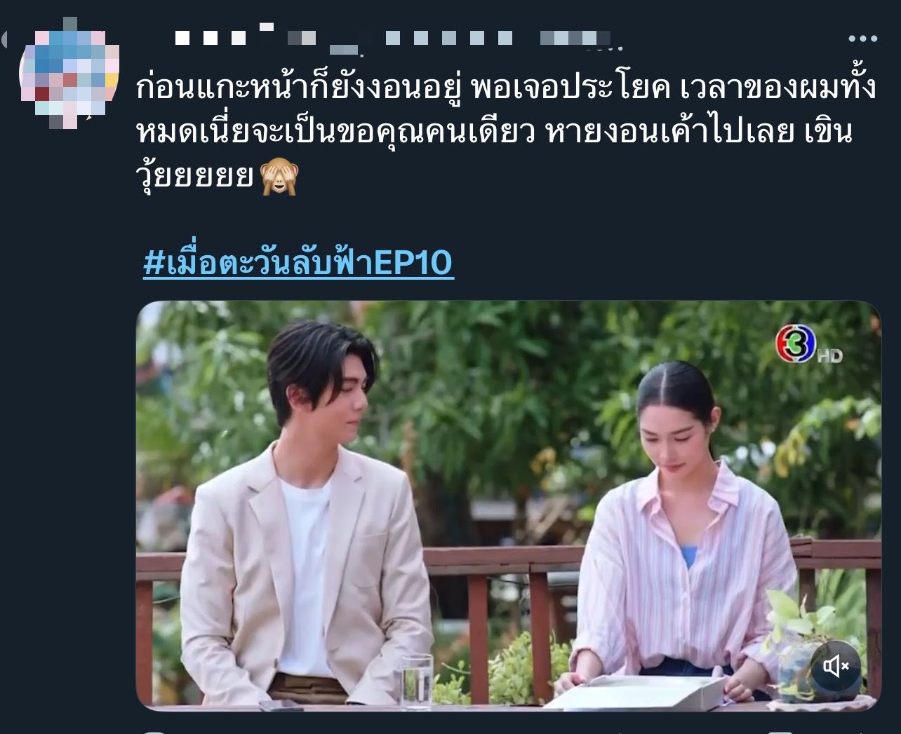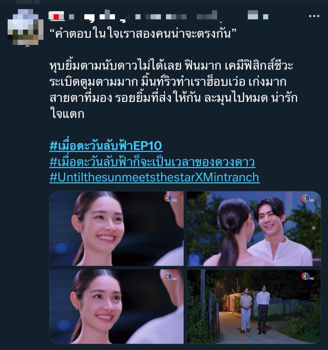 งานน้ำเอาคนดูยิ้มหน้าเบี้ยวเหงือกแห้งจน #เมื่อตะวันลับฟ้าep10 ติดเทรนด์ X ประเทศไทย เพราะ “คิมหันต์-นับดาว” ตกลงเป็นแฟนกันเรียบร้อย หลังจากน้องสาว อย่าง น้ำฟ้า(น้ำฟ้า ธัญญภัสร์) วางแผนช่วย ปฐวี(มีน นิชคุณ) จีบพี่สาวตัวเองให้สำเร็จ แต่แผนการกลับไม่เป็นอย่างที่คิดจนคนดูเบนเข็มตามเชียร์ให้กามเทพน้ำฟ้ายิงศรเข้าตัวเองสักที เพราะปฐวีเองก็เริ่มรู้ใจตัวเองแล้วว่าชอบใครกันแน่! เสิร์ฟหวานให้ได้ฟินได้สมใจก็มี เตชิต(วิลลี่ แมคอินทอช) เดินเกมสำคัญมอบโปรเจ็กต์ใหญ่ให้ปฐวีรับผิดชอบ เพื่อพิสูจน์ตัวเองต่อสายตาทีมผู้บริหาร เรียกว่าเป็นอีพีที่ทำคนดูทั้งมีความสุขทั้งเห็นใจไปตาม ๆ กัน