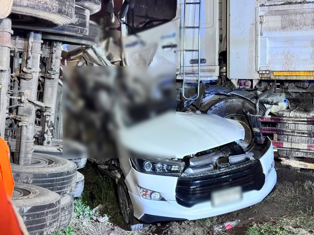 ที่เกิดเหตุ พบรถนั่งส่วนบุคคล สีขาว ป้ายทะเบียน 5726 กทม. สภาพถูกชนอัดก็อปปี้ระหว่างรถบรรทุก ป้ายทะเบียน 5589 ระยอง และรถบรรทุก 5685 ชุมพร ที่พลิกตะแคง
